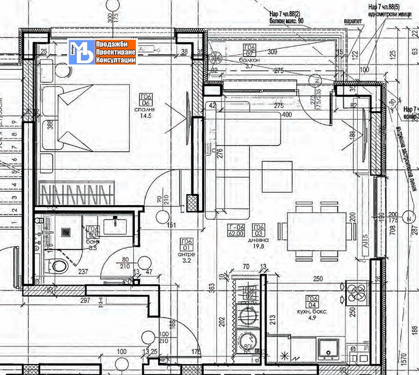 Апартамент Г-06 е разположен на трети етаж, с изложение запад. Обща площ - 69,19 кв.м. (застроена площ 62 кв.м.), състои се от дневна с кухня 23,7 кв.м., спалня - 15 кв.м., баня - 3,5 кв.м., антре - 3,2 кв.м., склад и балкон 3,5 м2. Към имота има процент идеални части от собствеността на земята, върху която е построена сградата. Цената е без включен ДДС.
