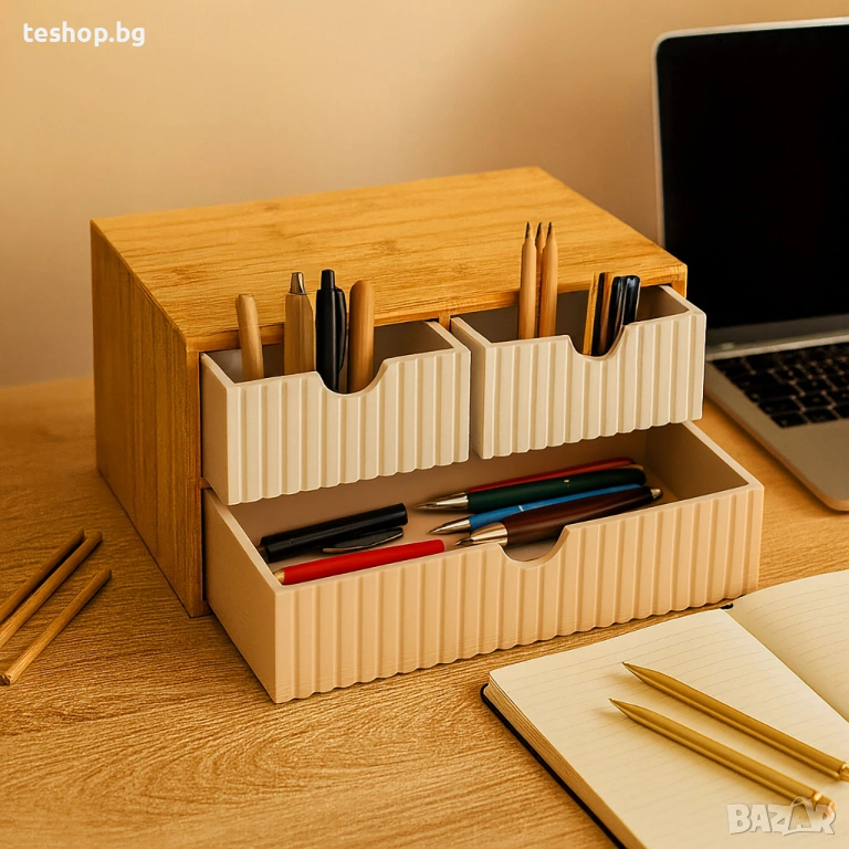 Органайзер за бюро с ребристи чекмеджета бамбук Relaxdays И ти ли си напълно уморен от разхвърляното и неорганизирано работно място и от всички онези разпръснати кламери и моливи? С този организатор за бюро с 3 чекмеджета в 2 размера ще стане много по-приятно да поддържаш офиса си подреден. Скрий своите писалки и други офис принадлежности в чекмеджетата и те веднага ще изчезнат от погледа. Между другото, можеш да използваш този органайзер и в банята или кухнята. Благодарение на съвременния и естествен вид, организаторът се вписва добре във всеки интериор.