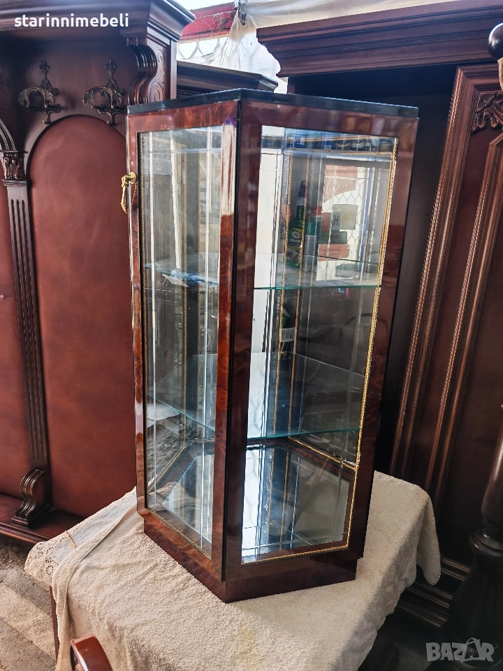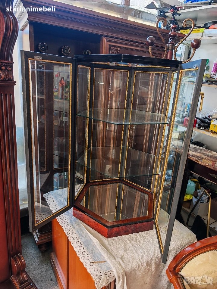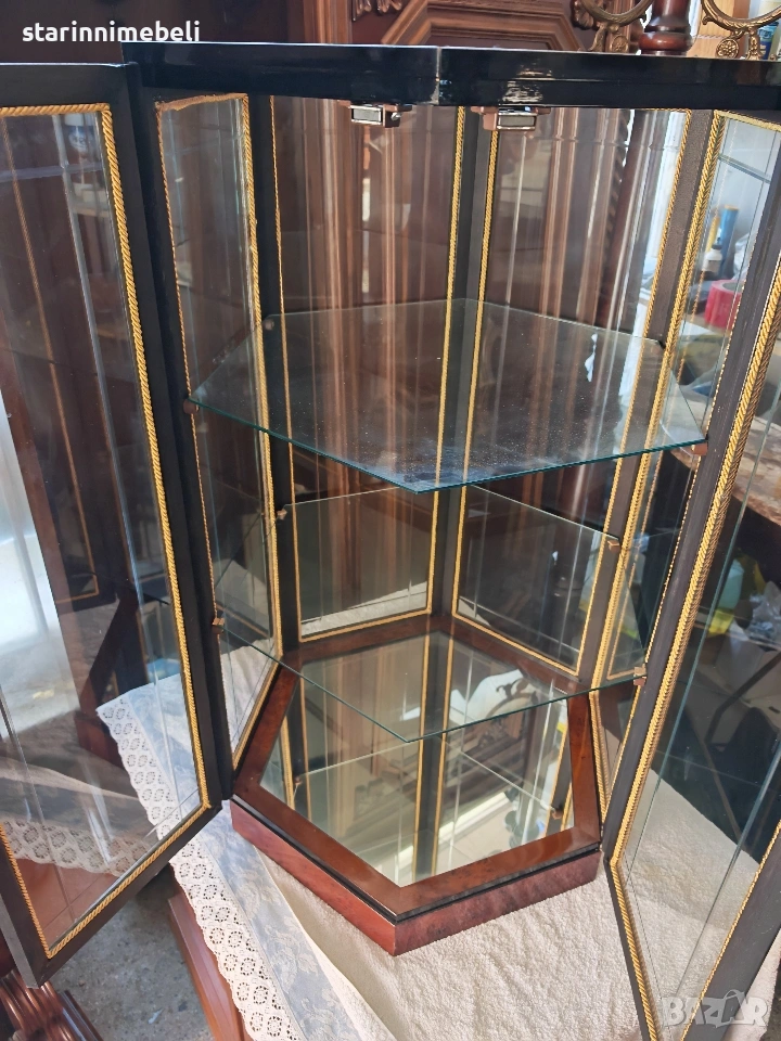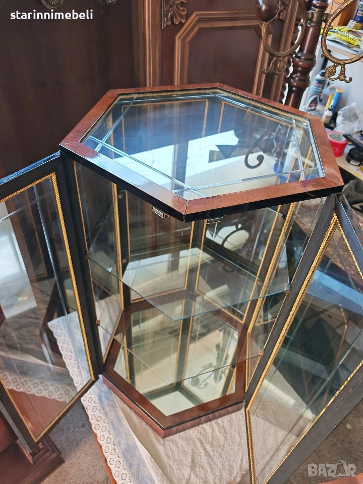 ​Продавам елегантна шестоъгълна витрина с огледално дъно и златисти детайли. Перфектна за антики, чаши или колекции!