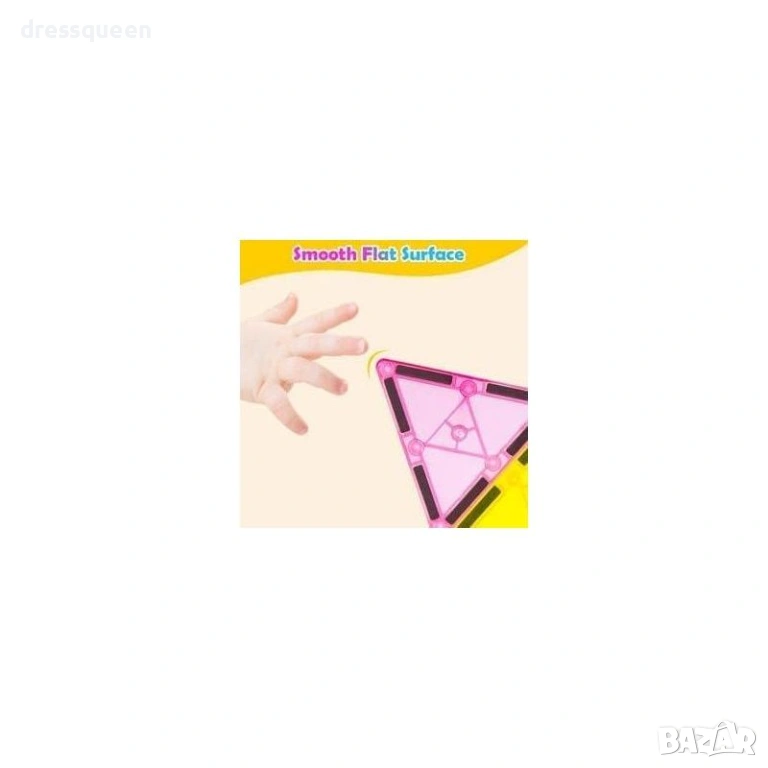 Геометрични магнитни части:2 оранжеви квадрата с прозорец и 3 сини квадрата с отвор. 6 жълти квадрата с кръстосана рамка за стабилна основа. 2 оранжеви и 2 зелени триъгълника за изграждане на високи кули.