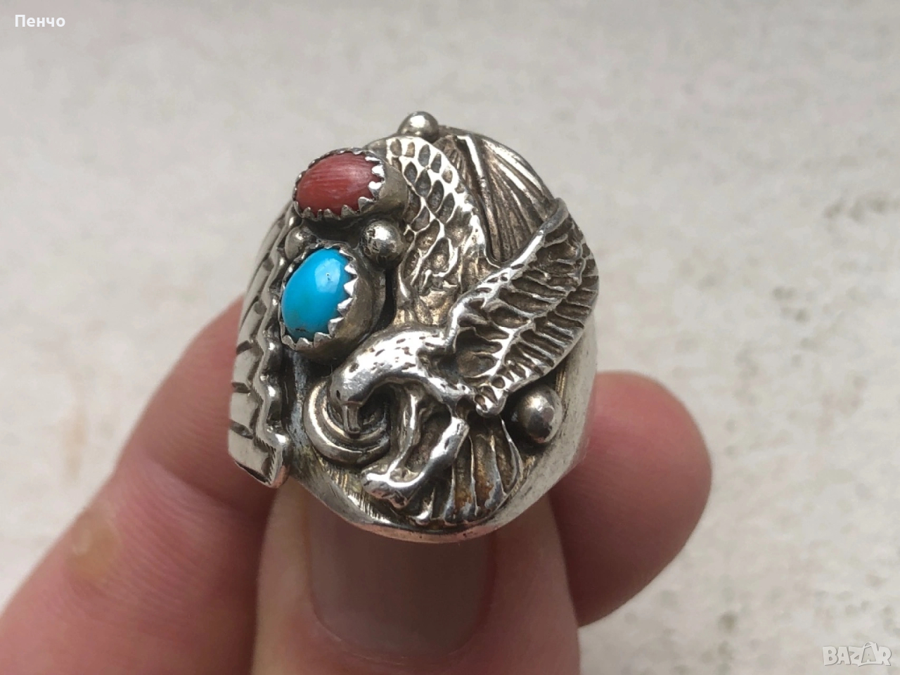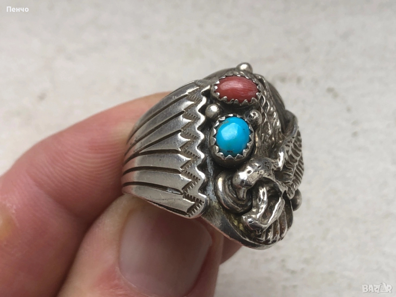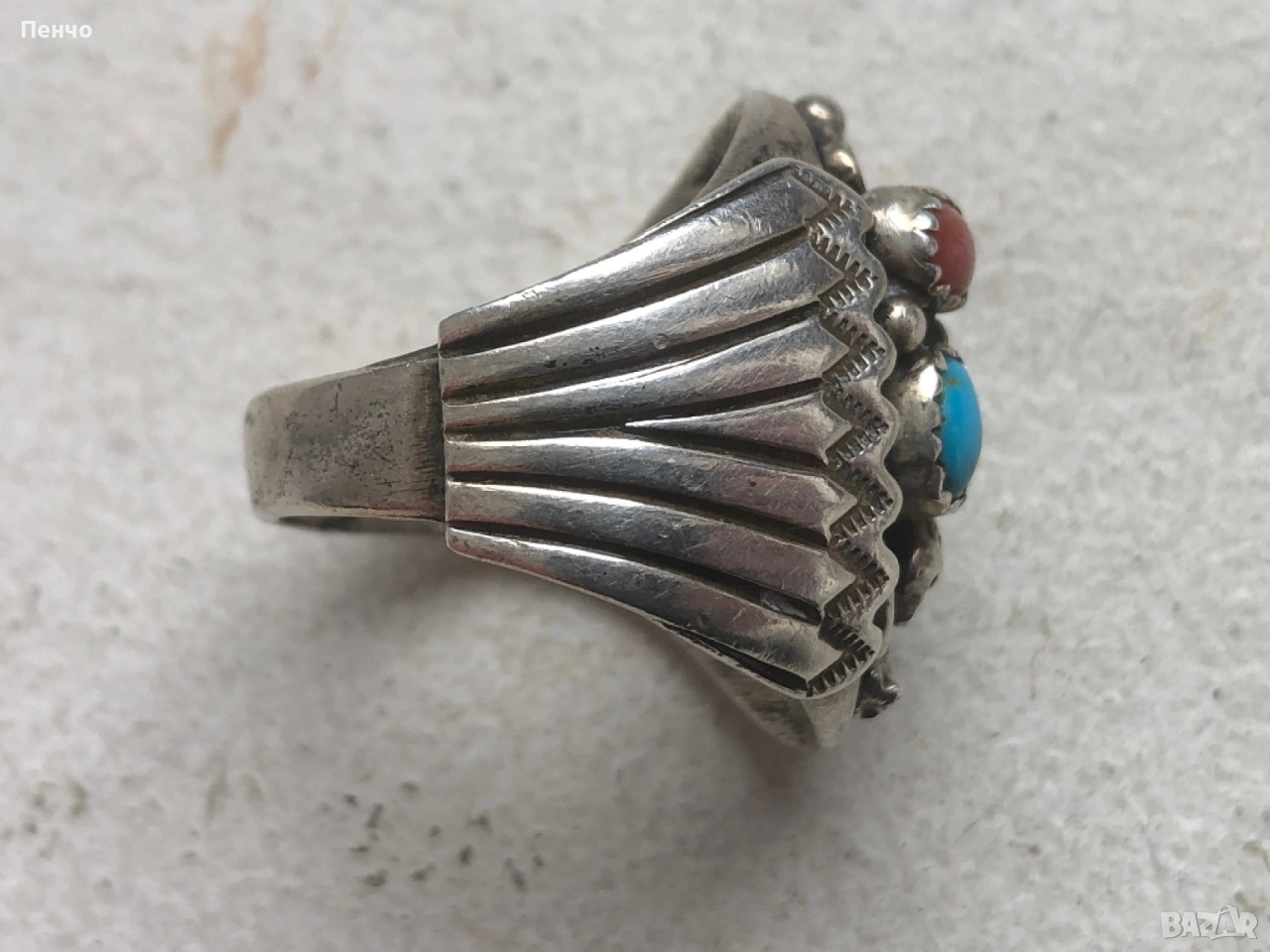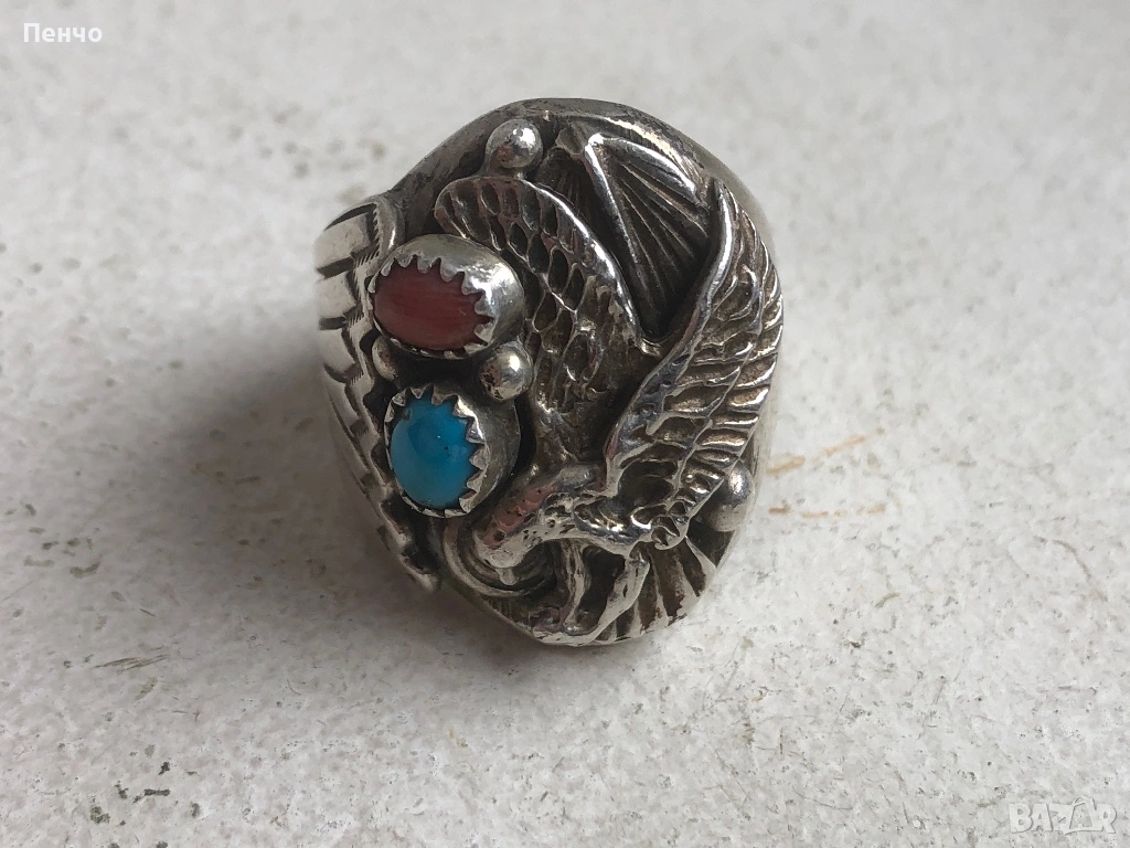стар дизайнерски сребърен пръстен с тюркоаз и корал → Обява 53653775