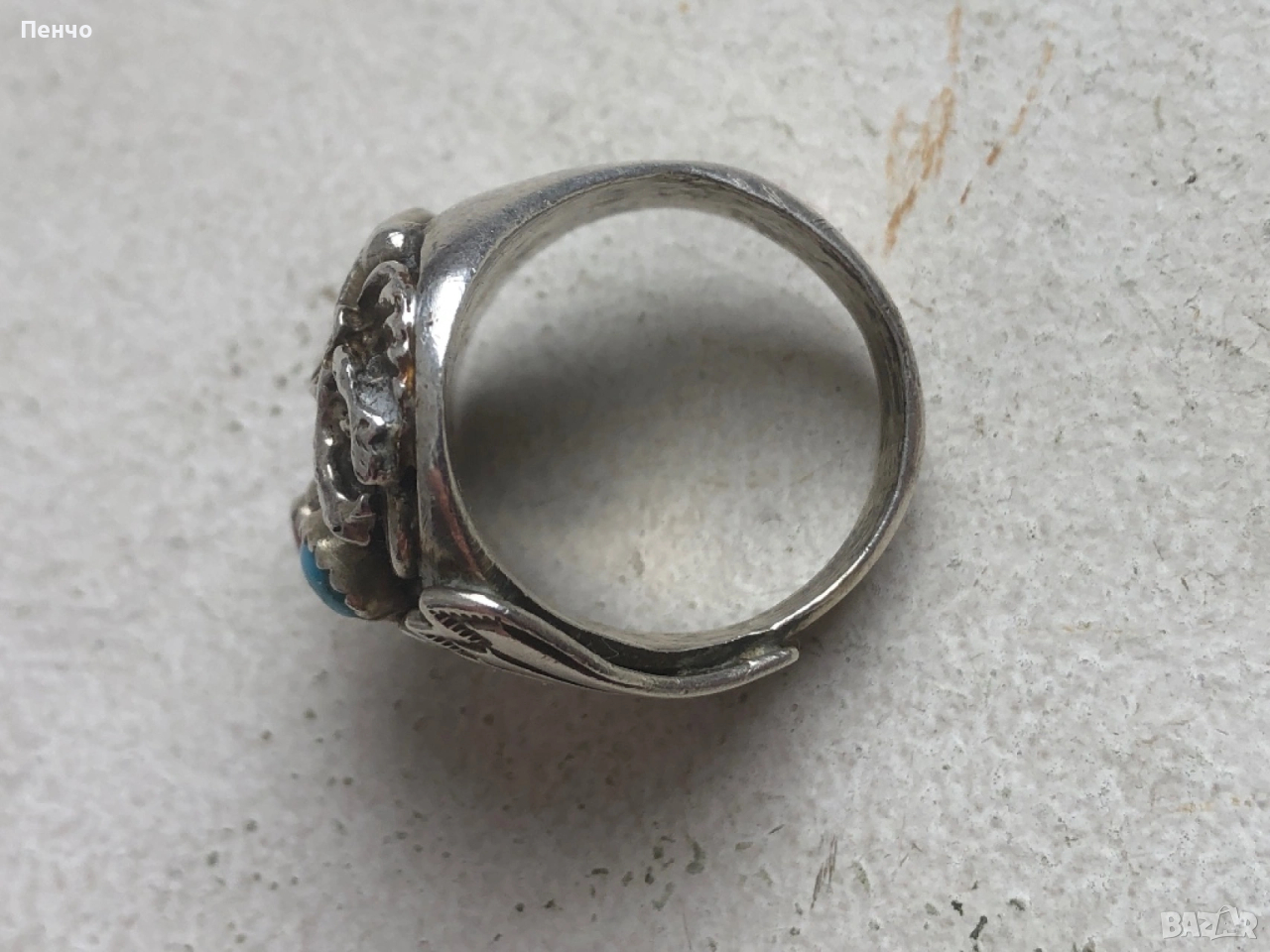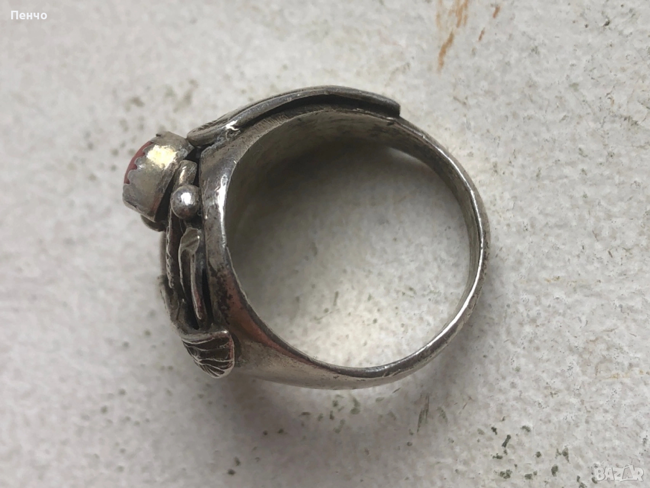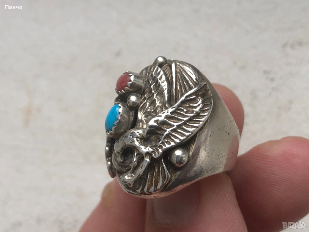 стар дизайнерски сребърен пръстен с тюркоаз и корал → Обява 53653775