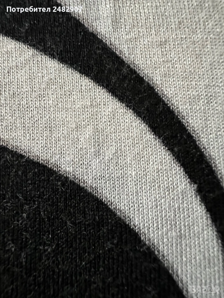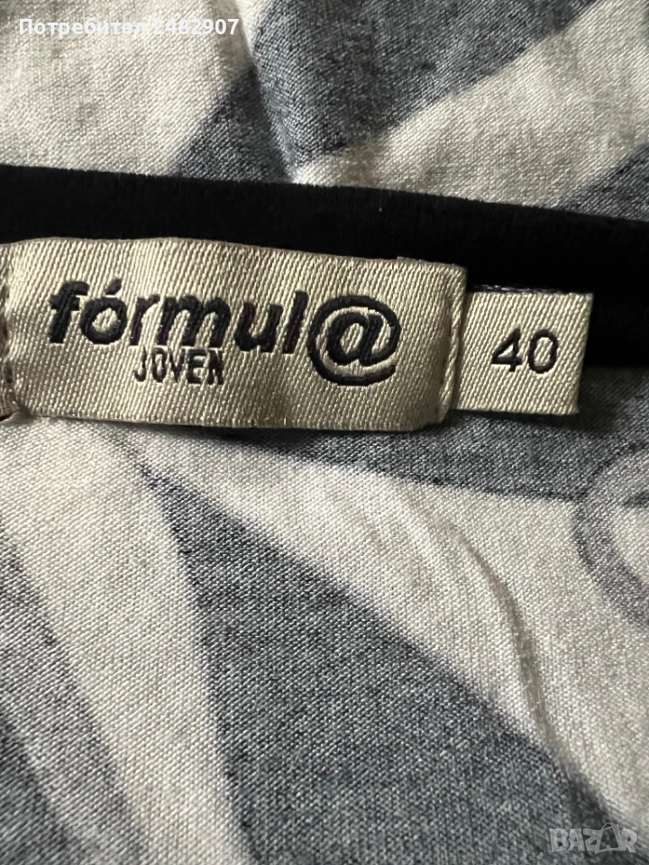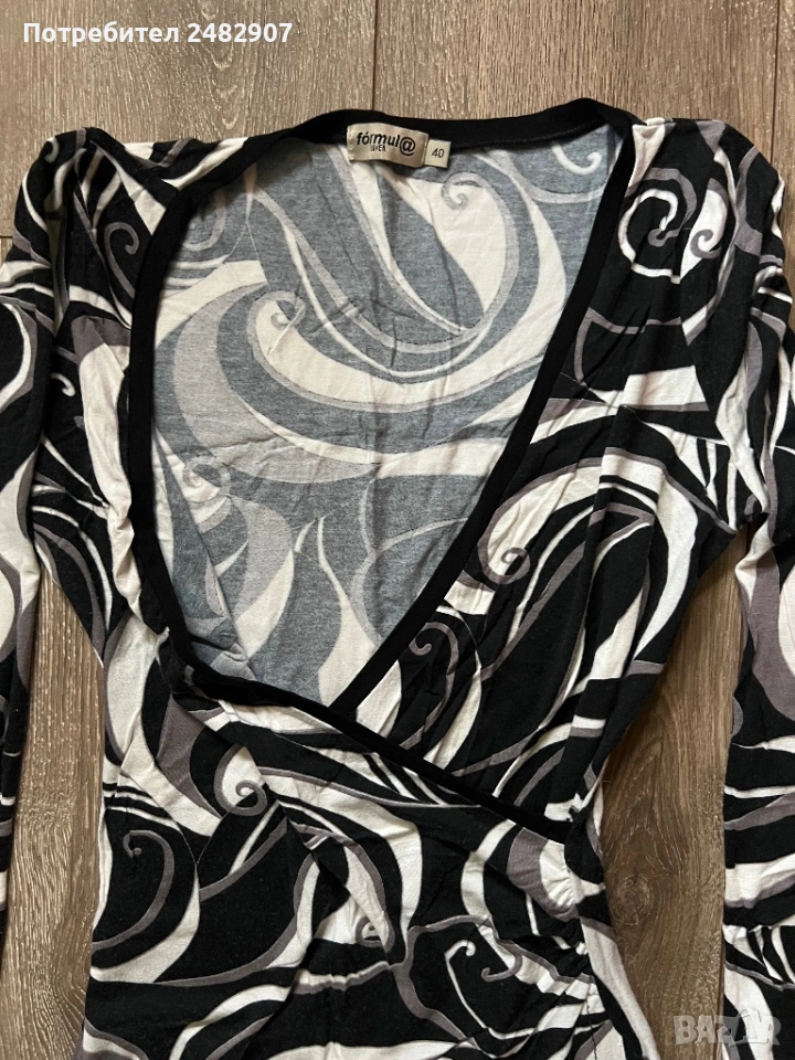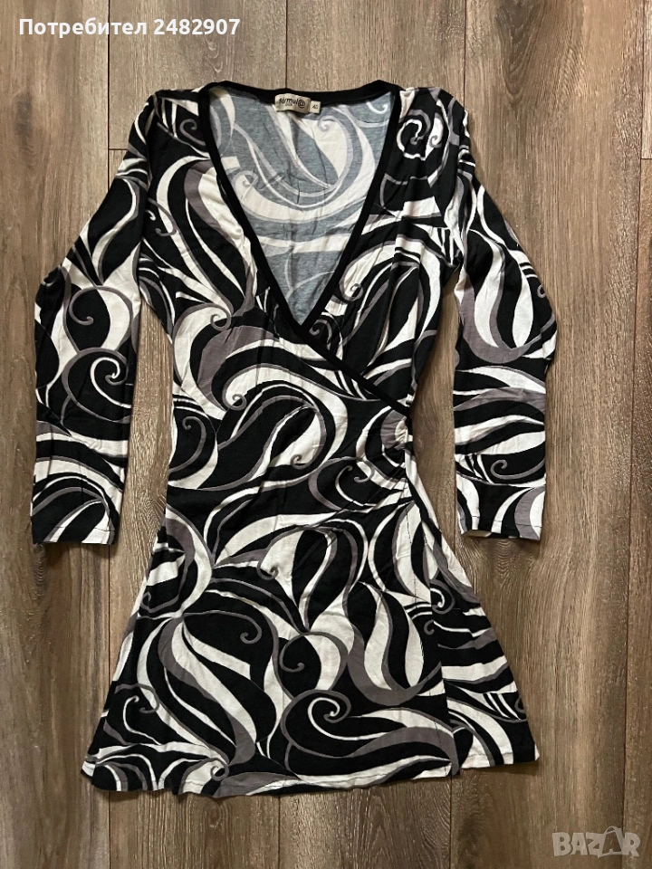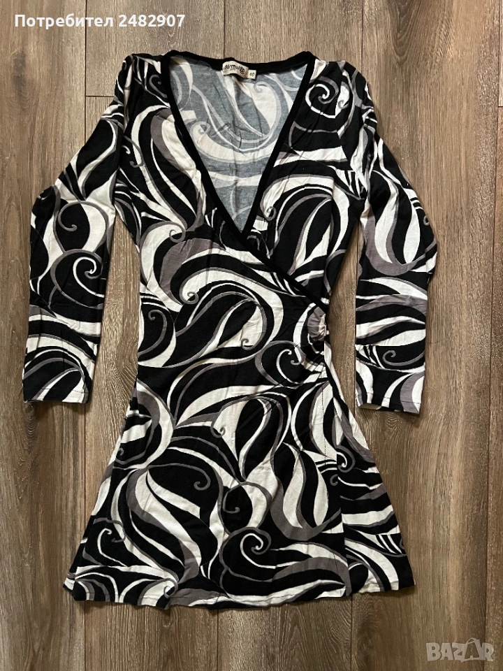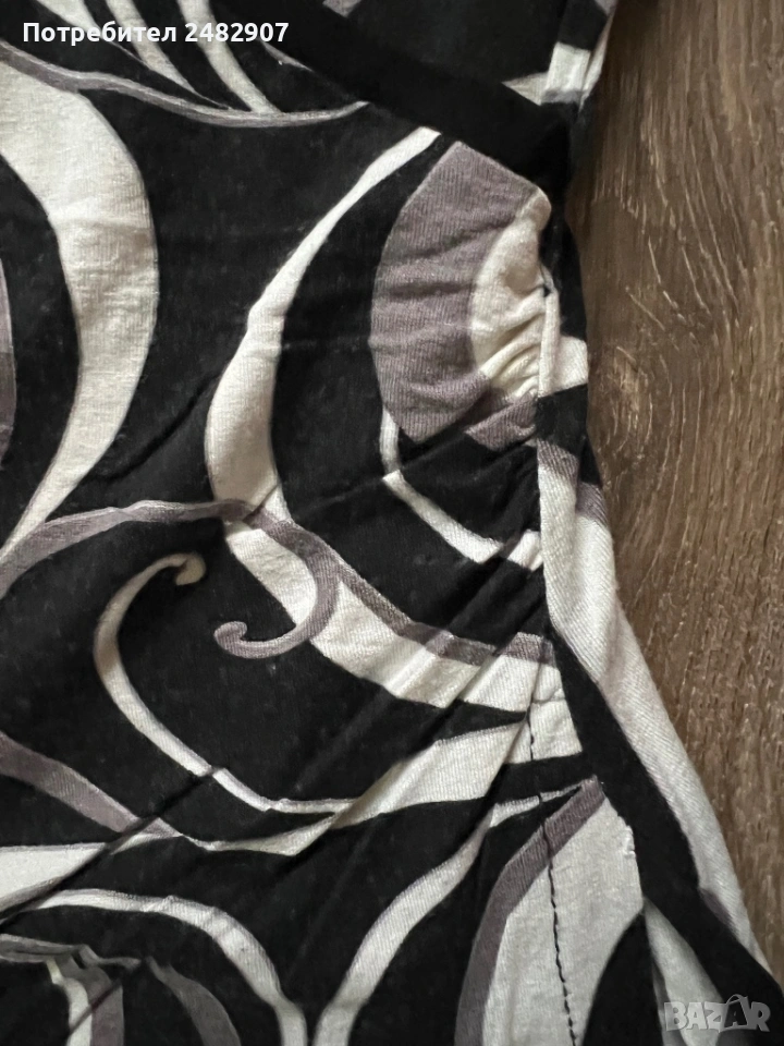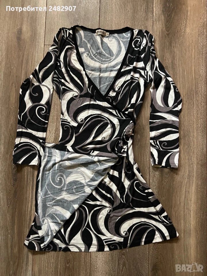 Къса дамска рокля в черно, сиво и бяло, размер 40. Съдържа 100 % вискоза. ширина в раменете - 33 см, ширина под мишниците - 41 см, ширина в долната част - 58 см, дължина от рамото до долу - 82 см, дължина на ръкава от рамото - 54 см, ширина на ръкава в долната част - 10 см. Много запазена, почти не е използвана, леко еластична.