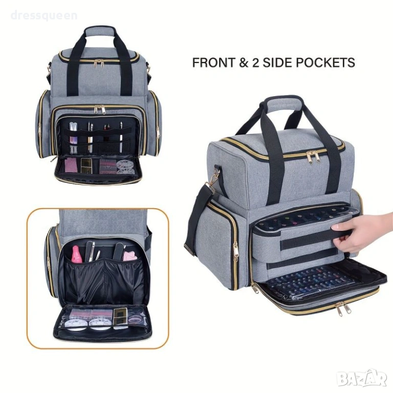 С размери 37 х 34 х 24 см, чантата побира всичко необходимо за цялостен маникюр на адрес.