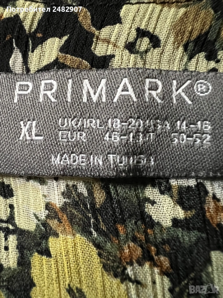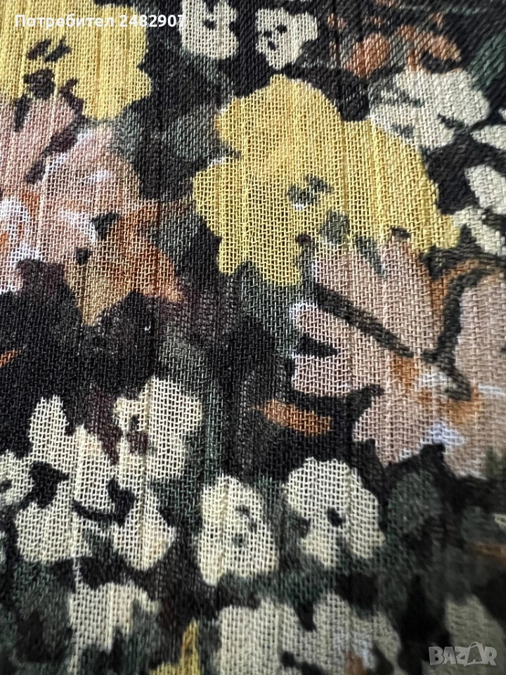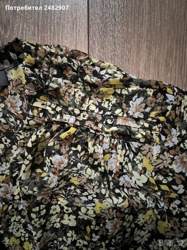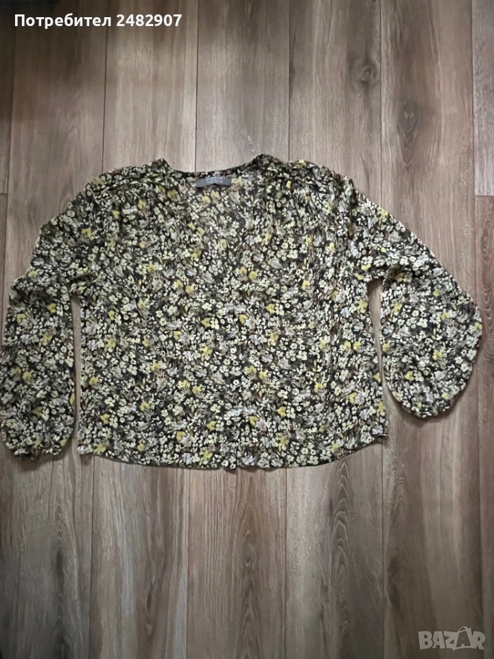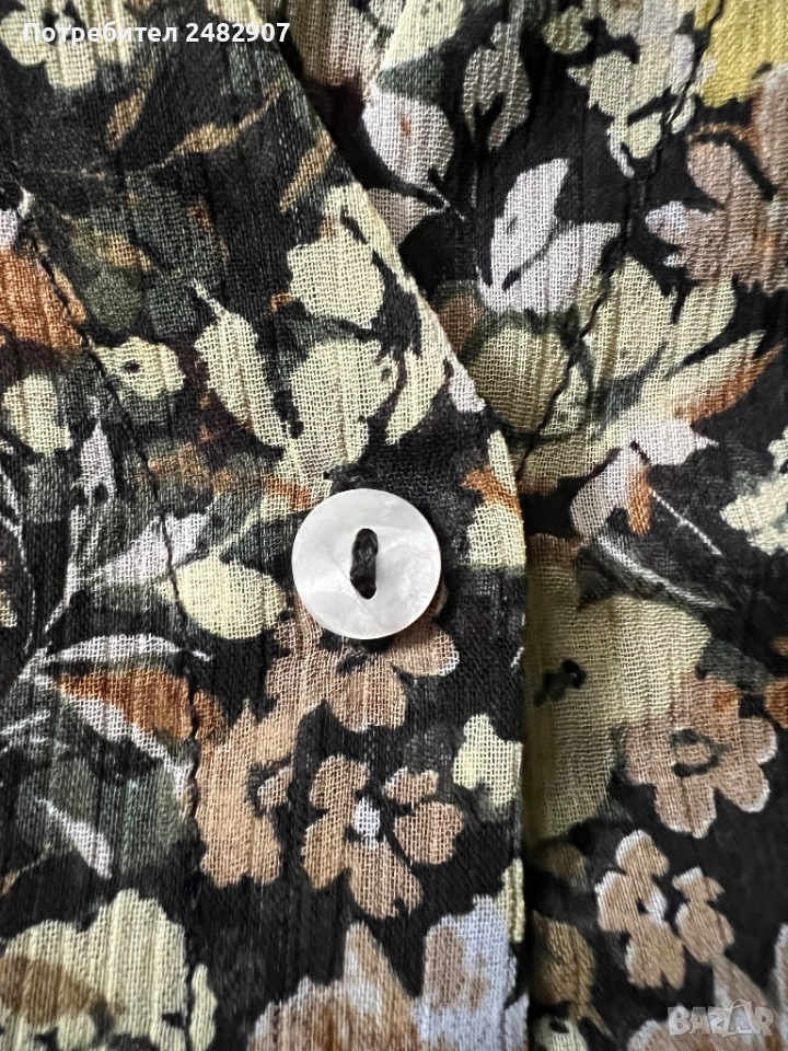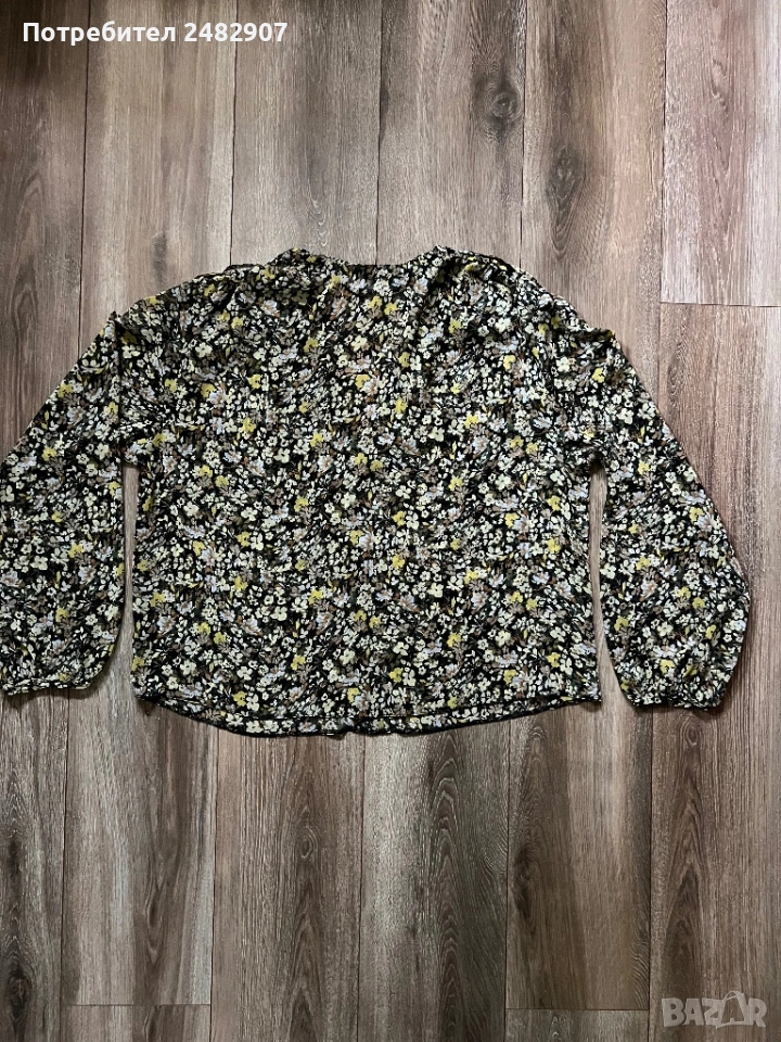 Свободна дамска риза с флорални мотиви, размер XL. Ширина в раменете - 52 см, ширина под мишниците - 63 см, ширина в долната част - 63 см, дължина от рамото до долу - 64 см, дължина на ръкава от рамото - 63 см, ширина на ръкава в долната част - 11 см. Много запазена, почти не е използвана, ефирна, полупрозрачна, не се мачка.