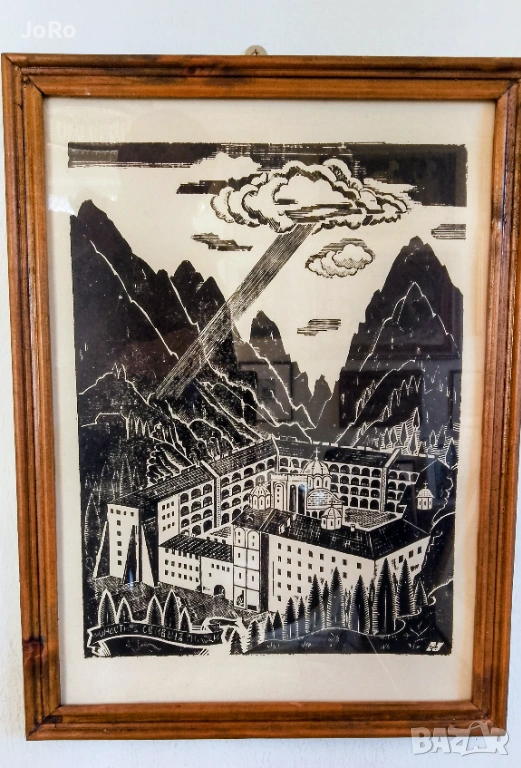 Продавам гравюра на дърво "Манастир Св. Иван Рилски" от проф. Васил Захариев. Състояние отлично, рамкирана в оригинална стара рамка подписана долу дясно в самия отпечатък. Размери 50х37см.