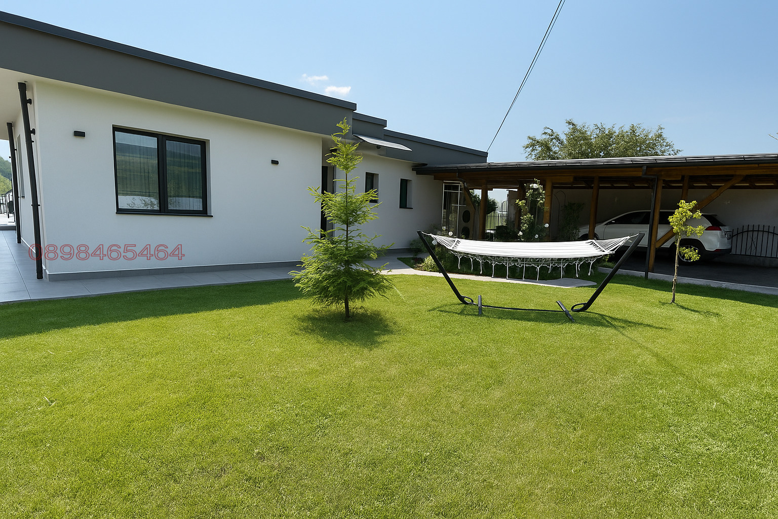 - Двоен навес/гараж достатъчен за две коли и допълнителни место за паркиране пред къщата