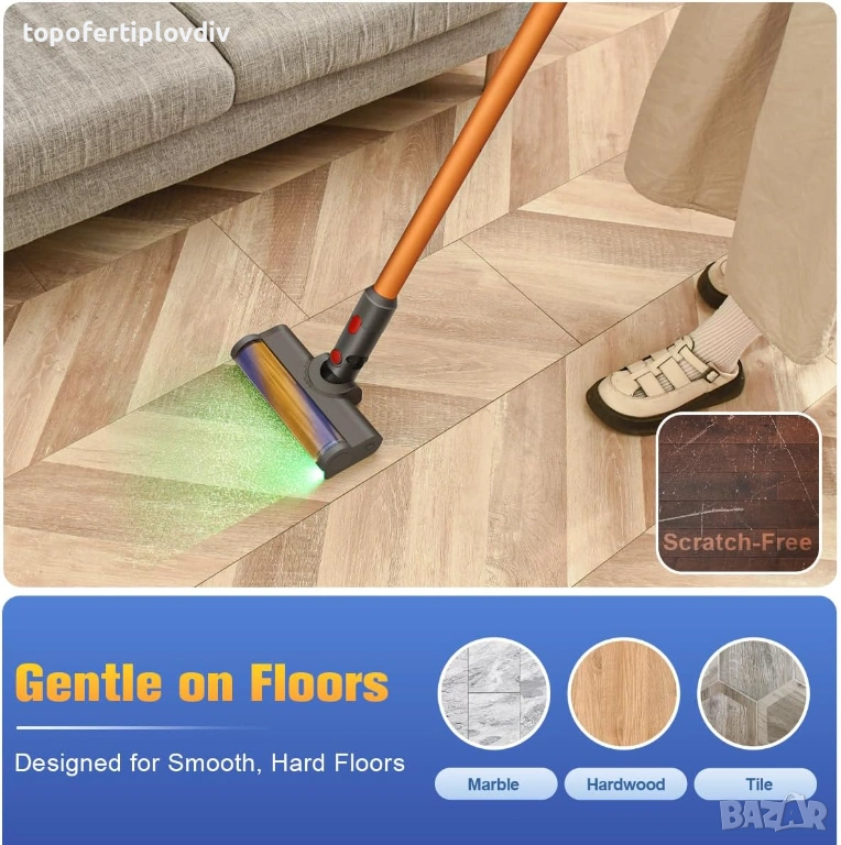 Подобрена видимост - Интегрирана с LED светлини, тази подова четка осветява скрития прах и отломки, което улеснява откриването на проблемни зони, изискващи цялостно почистване.