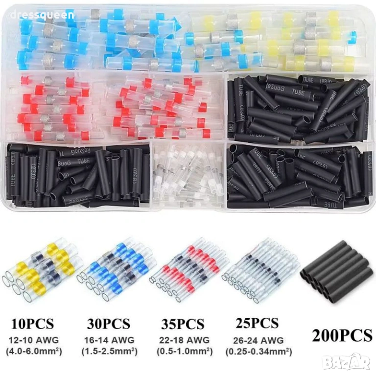В органайзера ще откриете 100 конектора с припой за кабели с дебелина от 0.25mm² до 6.0mm² (от 26 до 10 AWG).