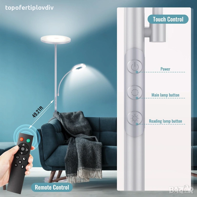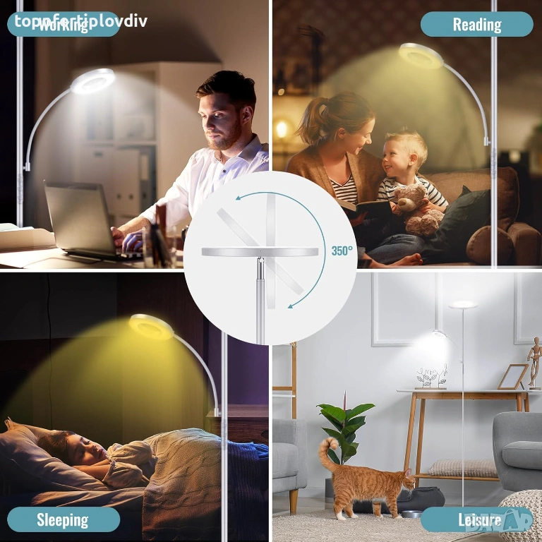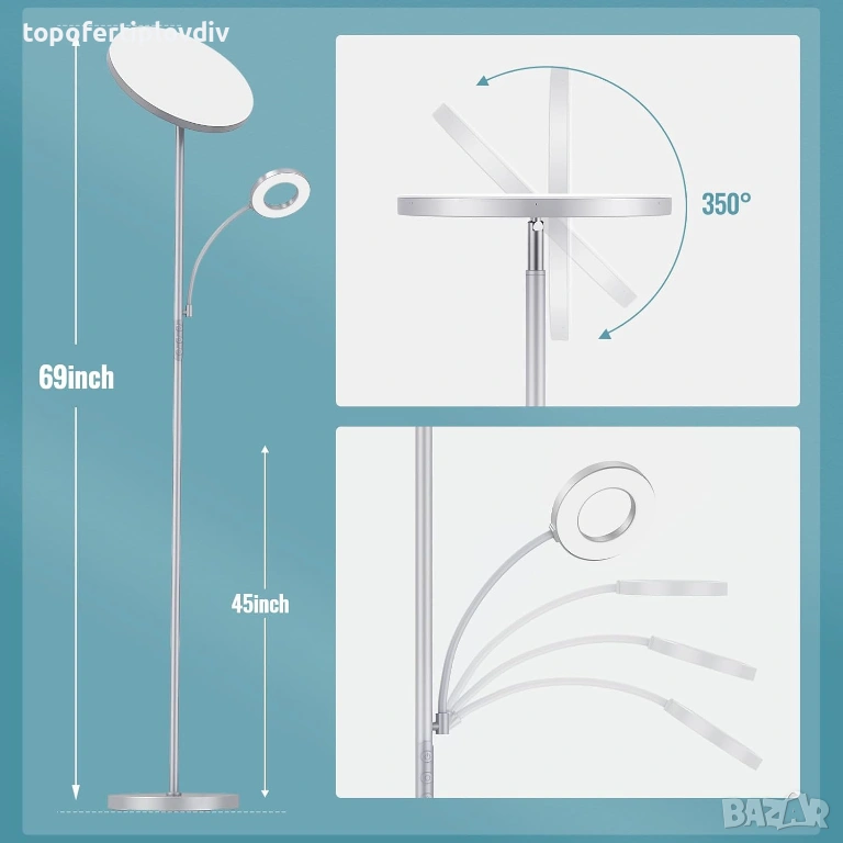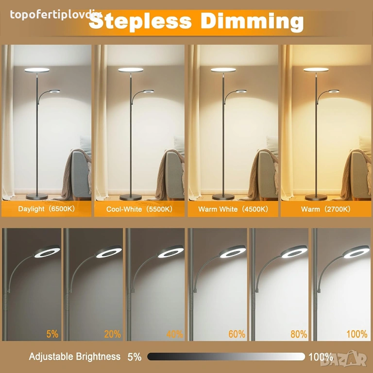 Безстепенно затъмняване и регулиране на паметта: Други димируеми подови лампи имат само 3 цветни температури и нямат режим на безстепенно затъмняване, докато и двете ни ярки лампи имат 4 цветни температури: 2700K - 6500K. Кратко натискане регулира яркостта чрез 10 нива (5%-100%), а дългото натискане позволява безстепенно затъмняване. Функцията за интелигентна памет запомня последните ви настройки за яркост и цветна температура, когато я включите отново. Много удобно! Регулируема глава на лампата и сертификация: Основната глава на лампата може да се завърта до 350° и да се регулира нагоре и надолу до 180°, а дъщерната лампа може да се огъва на 360°. Тя може да отговори на вашите различни нужди, за да освети всеки ъгъл. LED лампата за под е сертифицирана по FCC, CE и RoHS, а щепселът ѝ е UL сертифициран, което я прави професионална и безопасна.