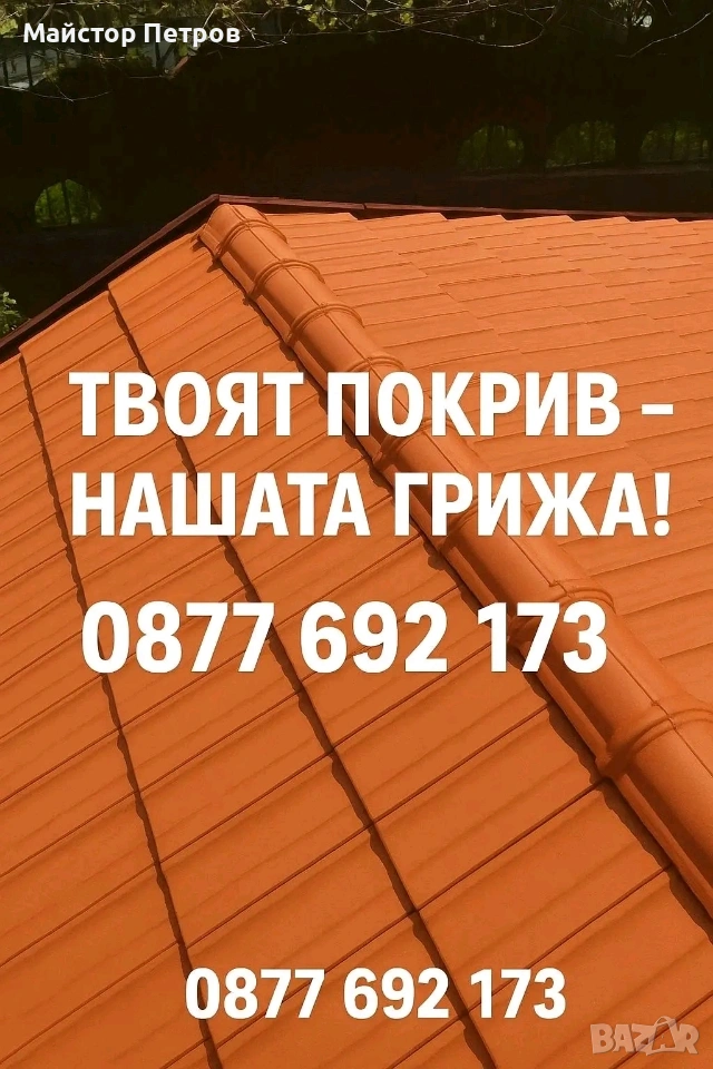 🏠 ТЕЧОВЕ? СЧУПЕНИ КЕРЕМИДИ? ВРЕМЕ Е ЗА НОВ ПОКРИВ! 🔨 НАШИЯТ ЕКИП ВИ ПРЕДЛАГА ✅ ПЪЛЕН И ЧАСТИЧЕН РЕМОНТ НА ПОКРИВИ ✅ ПРЕНАРЕЖДАНЕ НА КЕРЕМИДИ ✅ ХИДРОИЗОЛАЦИЯ И ТОПЛОИЗОЛАЦИЯ ✅ НАПРАВА НА НОВ ПОКРИВ ОТ ОСНОВИ ✅ОБШИВКИ, УЛУЦИ, ВОДОСТОЧНИ ТРЪБИ ✅ ОТСТРАНЯВАНЕ НА ТЕЧОВЕ ✅ КАЧЕСТВО И ГАРАНЦИЯ 💥 РАБОТИМ БЪРЗО, ЧИСТО И НА ДОСТЪПНИ ЦЕНИ! 💬 БЕЗПЛАТЕН ОГЛЕД И КОНСУЛТАЦИЯ НА МЯСТО! 🌍 РАБОТИМ В ЦЯЛАТА СТРАНА! 📞 ОБАДИ СЕ СЕГА: 0877 692 173 – МАЙСТОР ПЕТРОВ