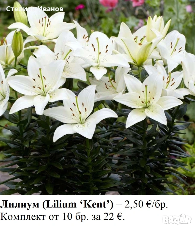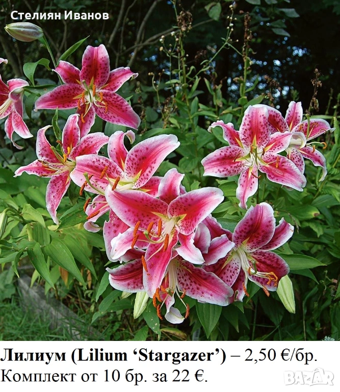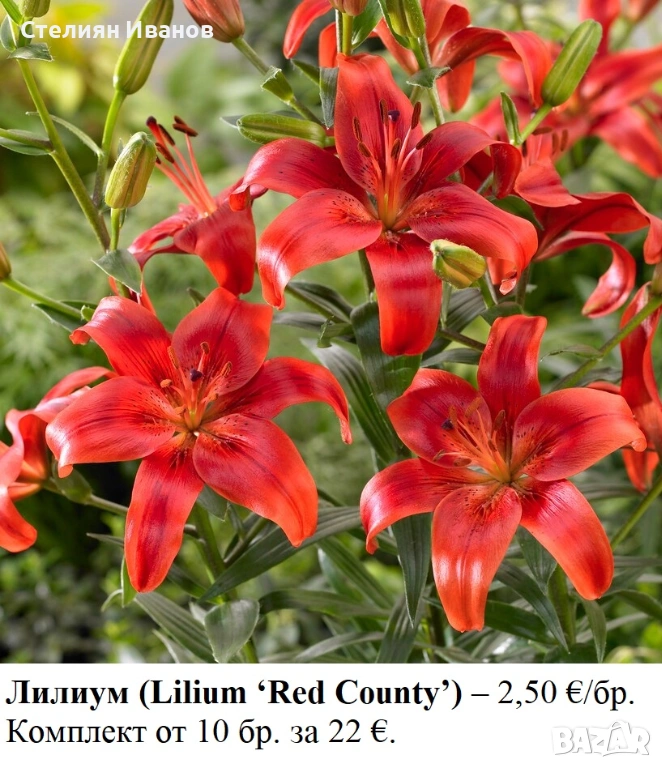 Луковиците и грудките са качествени, едри за вида си и с гаранция за вида и сорта. Ще цъфтят още тази година. За повече бройки има отстъпки (вижте снимките). Ако имате въпроси и/или желаете да поръчате, моля, изпратете ми съобщение.