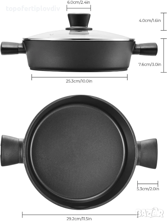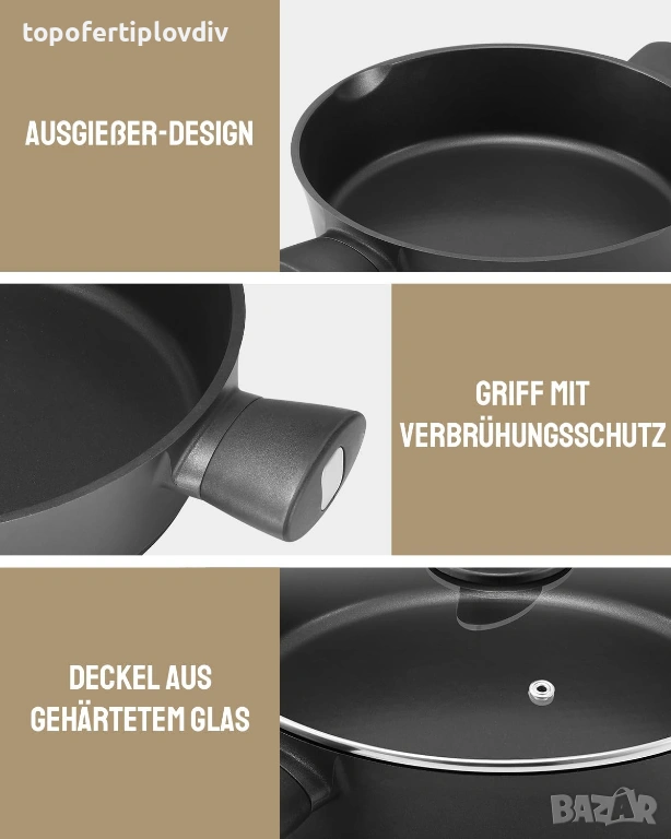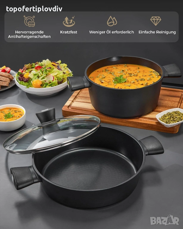 Високо качество - Благодарение на усъвършенстваната технология за леене под налягане, дебелият алуминиев съд е изключително издръжлив и устойчив на деформация и вдлъбнатини. Външната страна е покрита с топлоустойчиво покритие, което се характеризира с висока твърдост, здравина и устойчивост на надраскване.