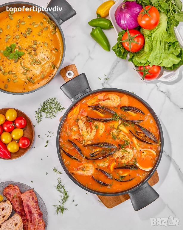 Подходящ за всички видове котлони - Композитното дъно от неръждаема стомана осигурява бързо разпределение на топлината и добро задържане на топлината. Съдът е подходящ за всички видове котлони: индукционни, електрически, газови котлони, халогенни котлони, керамични котлони и др.