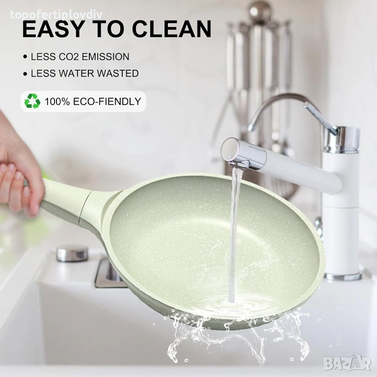 Лесен за почистване и екологичен малък тиган: Почистването е изключително лесно с хлъзгавата незалепваща повърхност и дизайна без нитове; просто избършете със сапун и вода. Препоръчва се ръчно миене, но е подходящо и за съдомиялна машина. Този тиган е изработен от 80% рециклиран алуминий, което намалява емисиите на CO2 с 80% за по-екологичен начин на живот.