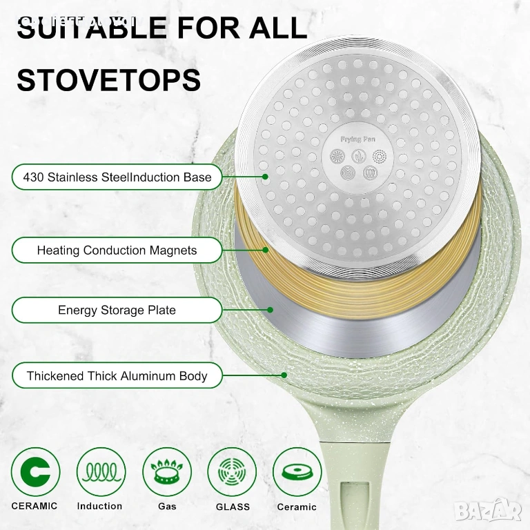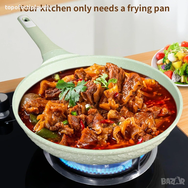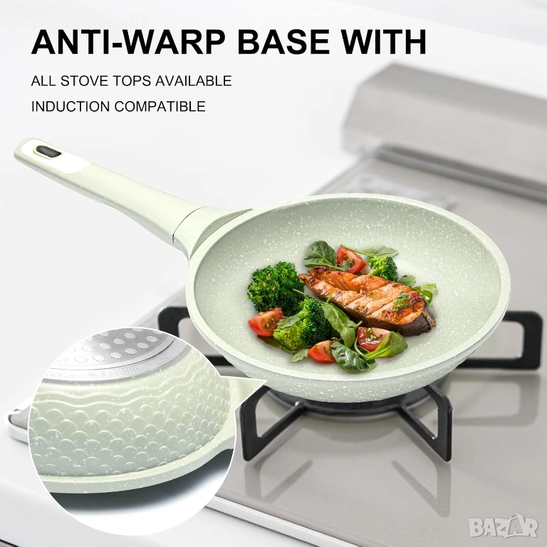 Съвместим с индукция и издръжлив дизайн: Като индукционен тиган, той се отличава с 5 мм дебело дъно и индукционна сърцевина от неръждаема стомана 430 за бързо и равномерно нагряване на всички котлони - индукционни, газови, електрически, стъклени и керамични. Изработен от здрав лят алуминий, той е безопасен за фурна до 400°C (без дръжката) и е издръжлив за дългосрочна употреба.