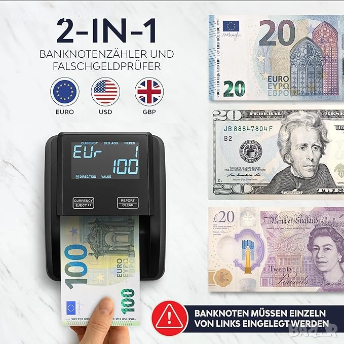детектор за фалшификати и брояч на банкноти в едно може да обработва различни валути. Той разпознава и брои купюрите евро, долари и британски лири и изчислява отделна сума за всяка валута. За прецизно и надеждно разпознаване банкнотите трябва да се поставят поотделно.