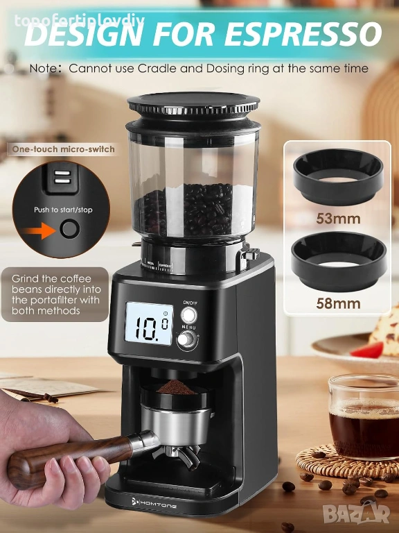 Съвместима с портафилтър за еспресо Предлага се с две скоби: 53 мм държач, съвместим с 51-54 мм държачи за филтри, и 58 мм държач за 58 мм държачи за филтри. Автоматично активиране чрез микропревключвател, смилането се извършва директно в портафилтъра, без отпадъци или замърсявания.