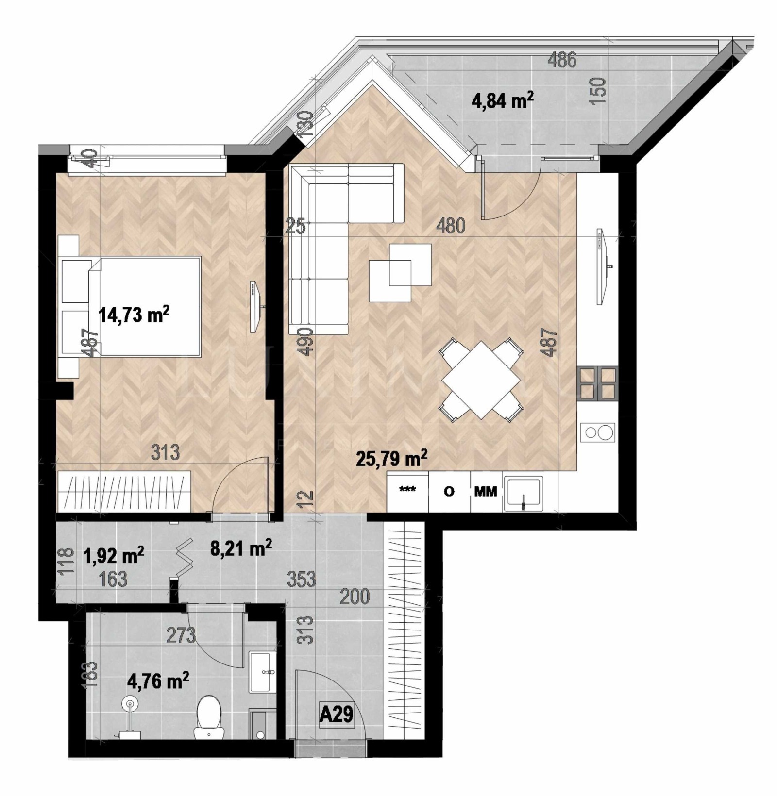 Апартаментът е двустаен, ситуиран на етаж 3 и има обща площ 79.70 кв.м.