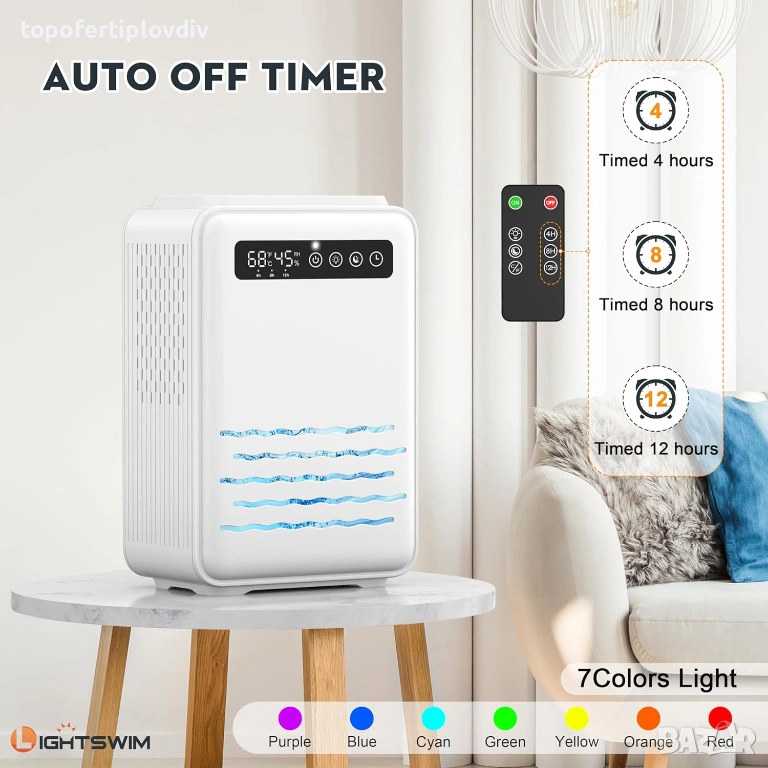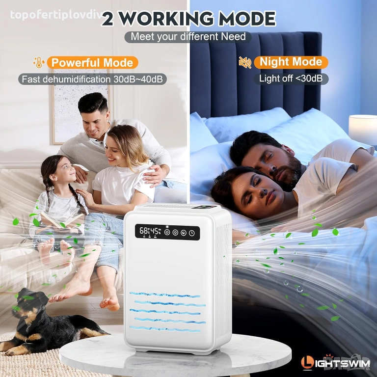 Мощен и нощен режим: Мощният режим бързо и ефективно намалява влажността. Нощен режим (режим на сън), тиха работа (<30 db), докато спите. Седемцветните променящи се светлини са предназначени за спалня, като могат да се настроят постоянно на предпочитания от вас цвят, могат да служат като нощна лампа, създавайки приятна и романтична атмосфера за сън.