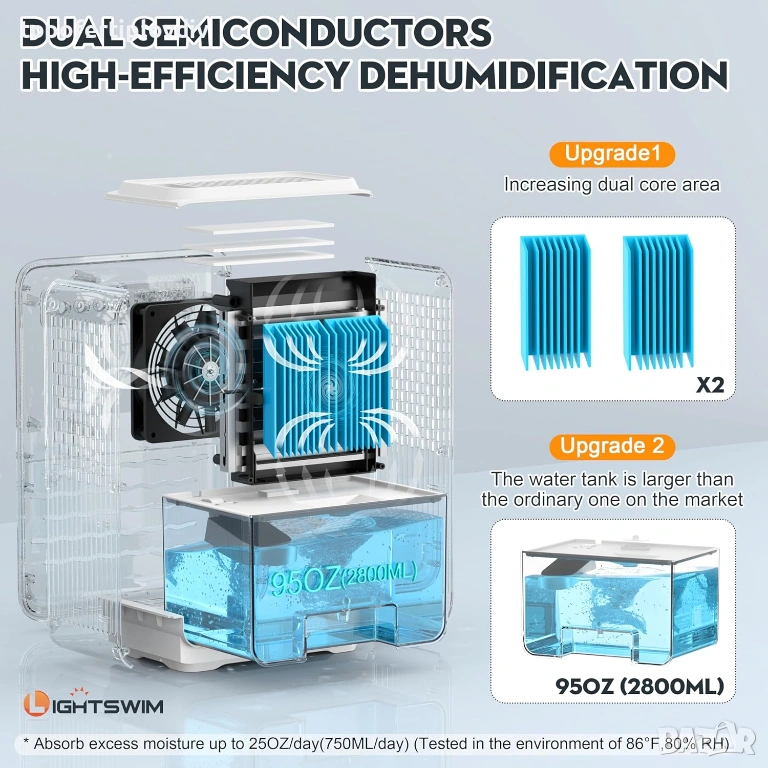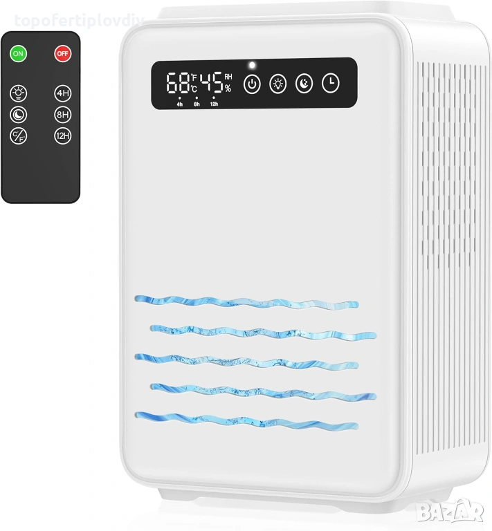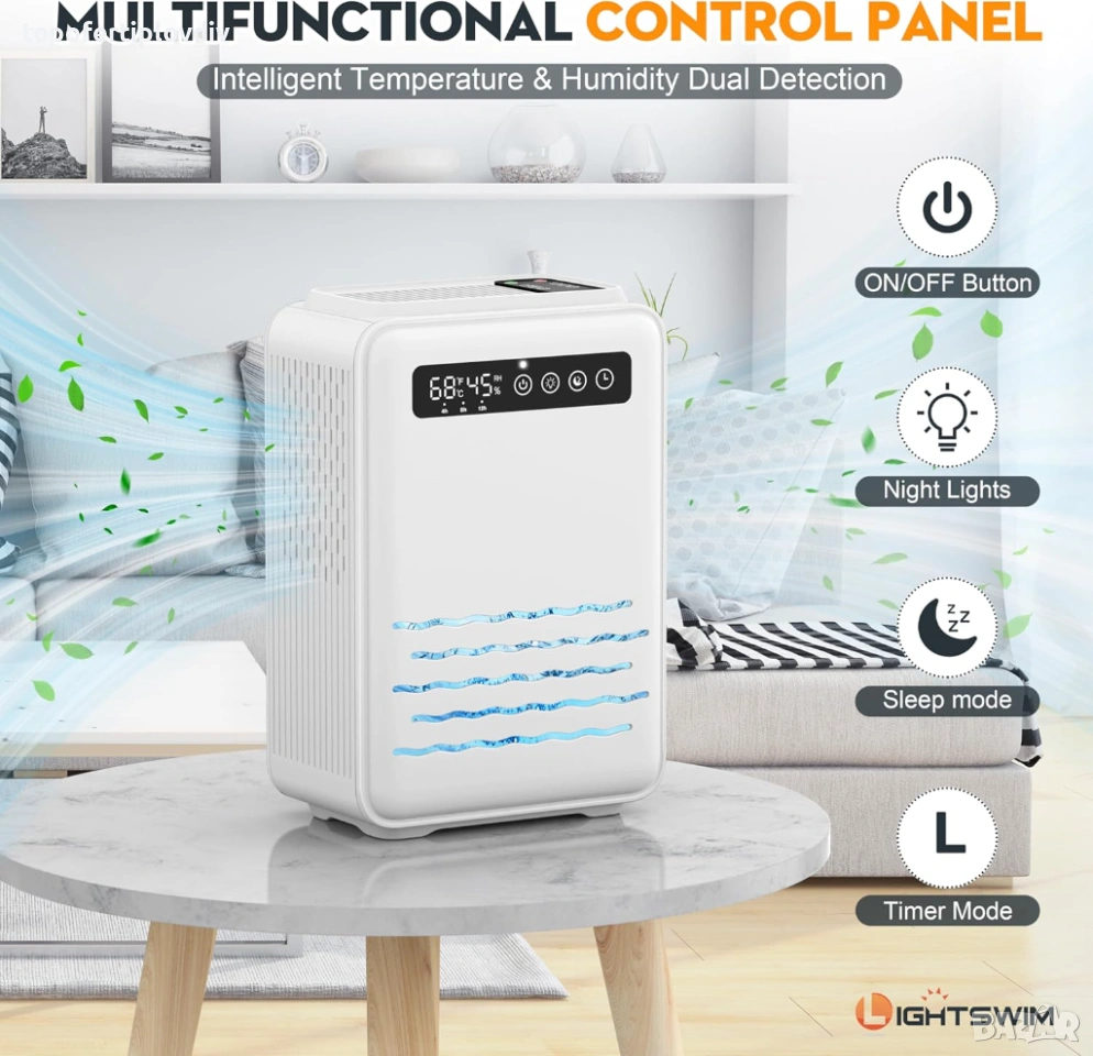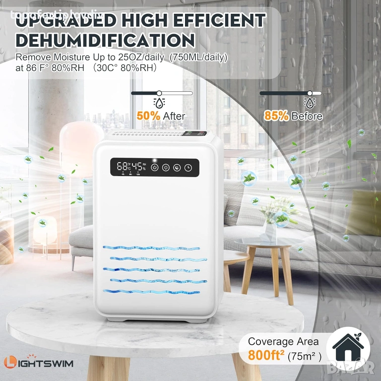 Компактен размер: Размерът е 340 x 145 x 227 мм (13,38 x 5,7 x 8,93 инча), лесно се премества в спални, бани или други места. И може да покрие площ от 800 кв. фута (75 м²), идеален за употреба като влагоабсорбатор за спалня, гардероб, баня, мазе и др.