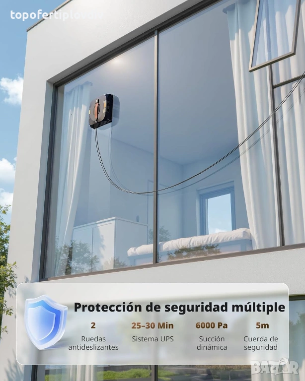 БЕЗОПАСНО И НАДЕЖДНО : Засмукване от 6000Pa държи робота здраво закрепен към стъклото. С 4-метрово предпазно въже и UPS система, той може да остане повече от 25 минути и да алармира при прекъсване на захранването.