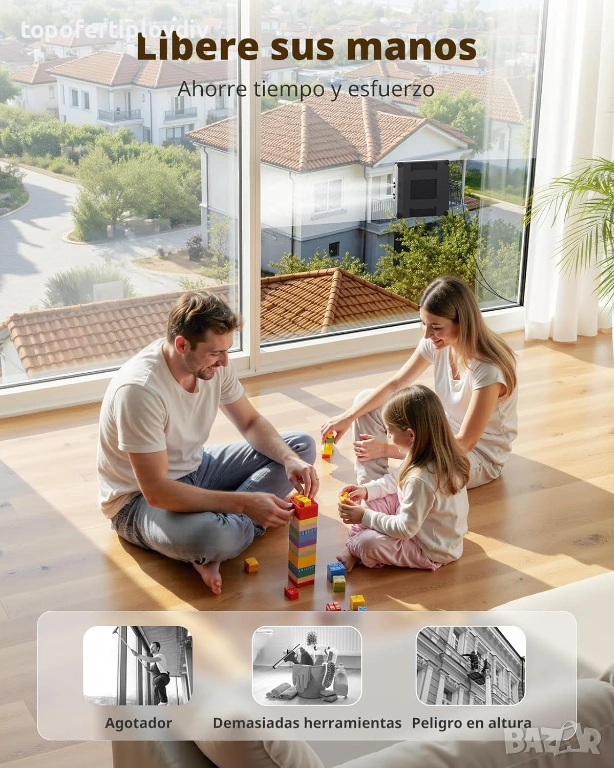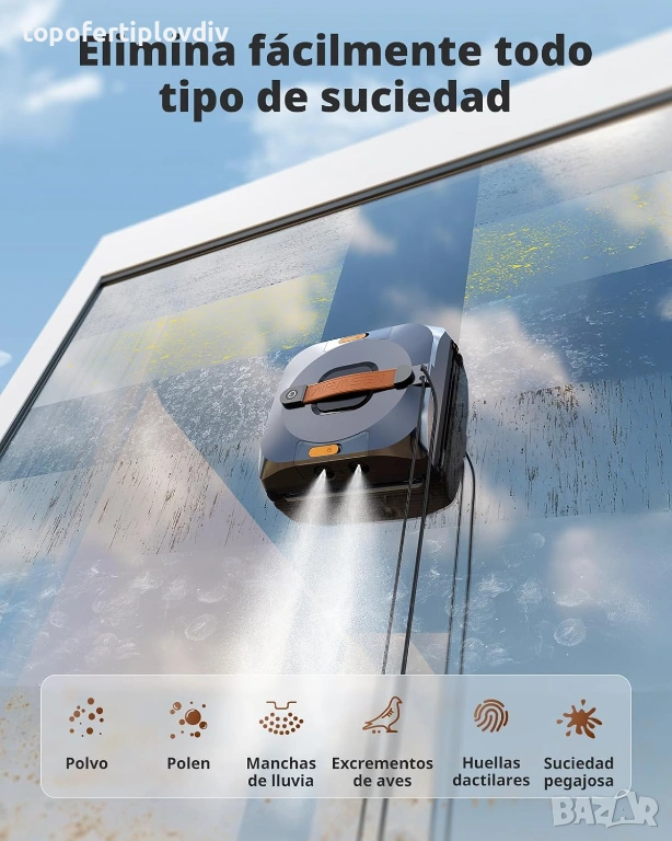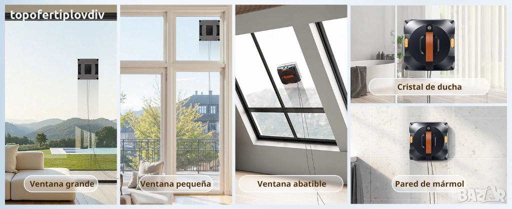 Употреба върху множество повърхности : Не само за прозорци, но и за душ кабини, огледала, гладки плочки. Минимален размер на прозореца: 50 x 30 см.