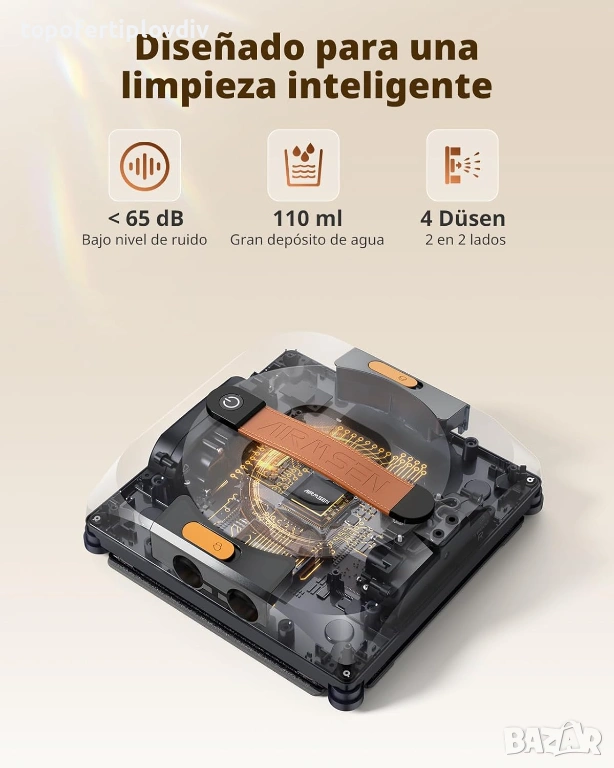 Безпроблемно почистване :Изберете от 4 интелигентни режима чрез приложение или дистанционно. С 4 дюзи за високо налягане и резервоар от 110 мл, той разтваря мръсотията преди маршрута си за бързо и цялостно почистване. Независимо дали става въпрос за петна от дъжд, прах или птичи изпражнения - той ги премахва.