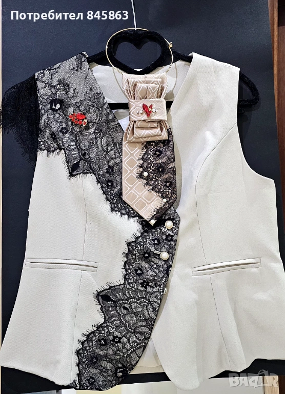 Ръчно изработени елек и вратовръзка, една бройка без възможност за повторение. Стои страхотно както с панталон, сатенена пола, така и с класически дънки. Вратовръзката може да се носи отделно с включено колие.