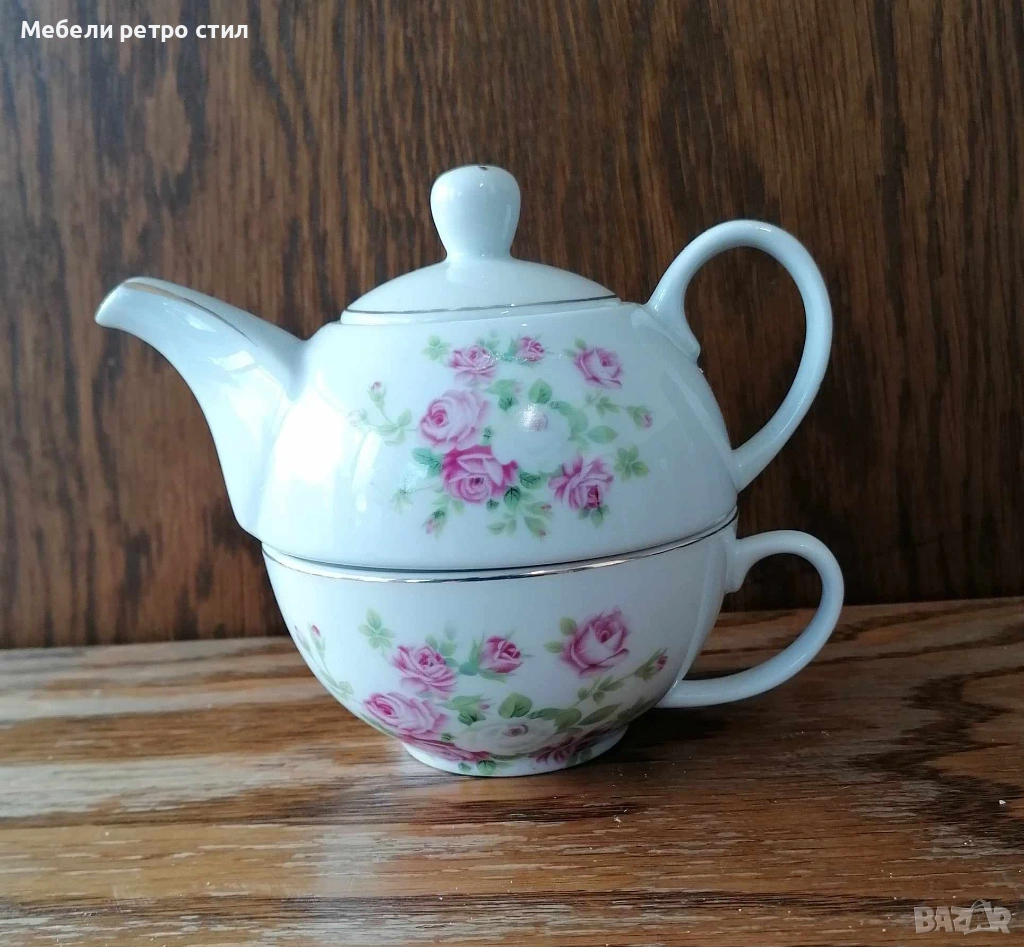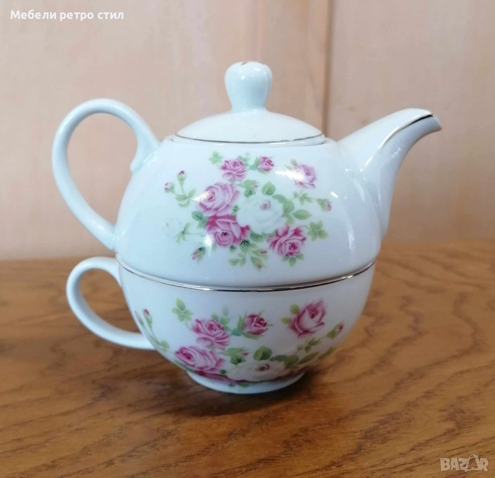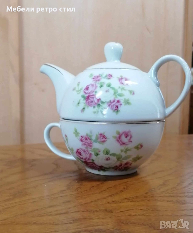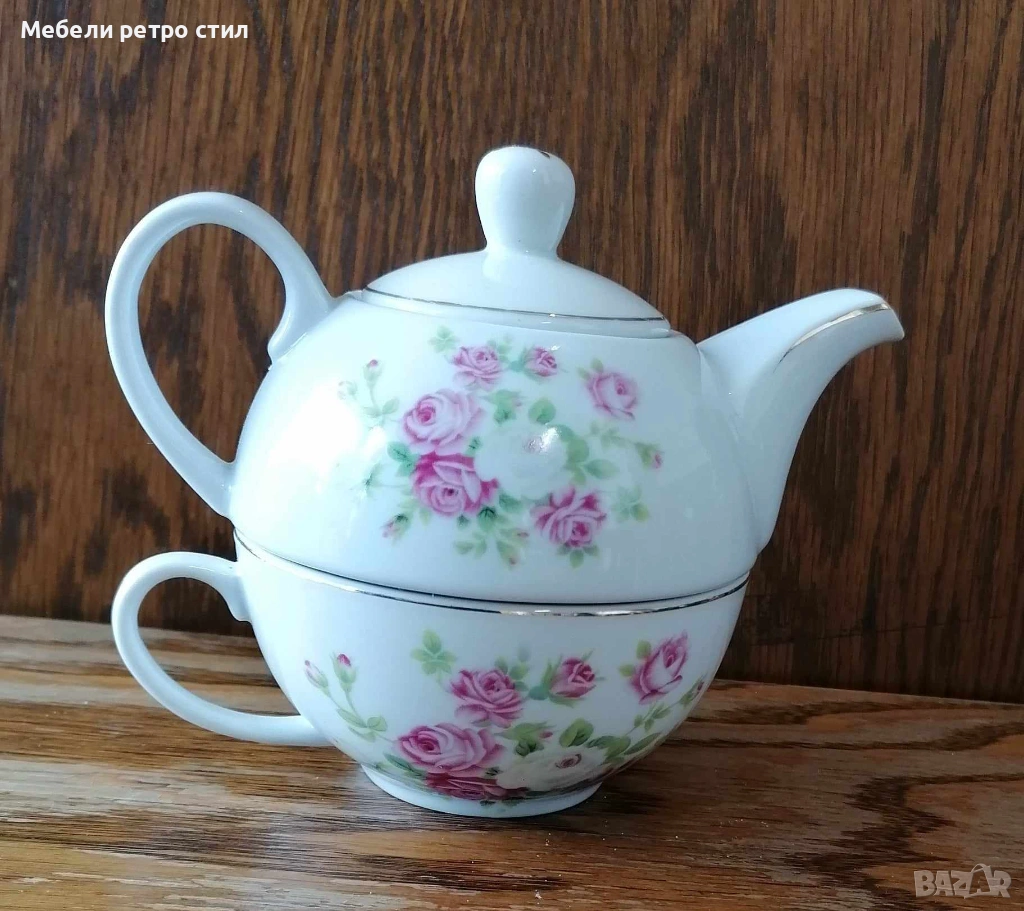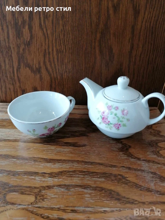 Изключително нежен винтидж комплект от фин порцелан - чайник с чаша за чай / кафе. → Обява 53655139