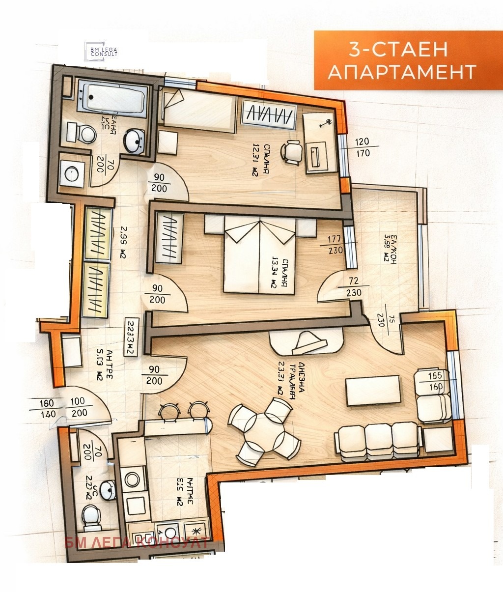 Предлагаме светъл,топъл и много функционален тристаен апартамент с обща площ от 106,15 кв.м. и чиста площ от 90,23 кв.м. Състои от антре с коридор, в края на който е обособено мокро пространство за пералня и сушилня, дневна с кухненски кът с обща площ от 29,37 кв.м., две спални - 13 кв.м. и 14 кв.м., баня с тоалетна и тоалета за гости. От едната спалня и всекидневната се излиза на балкон с площ от 6 кв.м. Целият апартамент е с югоизточно изложение. Дограмата е дървен стъклопакет. Има монтиран климатик Митсубиши. Отоплението е на газ с газово котле на Имергаз. Както в банята, така и в тоалетната има изводи за бойлер и при желание може да се монтират такива. Прозорците и вратите към терасата са с външни ролетни щори. Има СОТ. Входът е поддържан, с контролиран достъп. Апартаментът е обзаведен и има нужда от освежаване. Намира се на първи жилищен етаж над магазини. Към апартамента има мазе с площ от 5.76 кв.м. Апартаментът се продава само заедно с гараж в сутерен с площ от 20 кв.м. на цена от 50 000 евро.