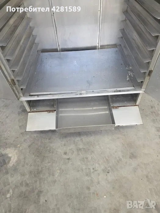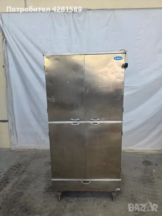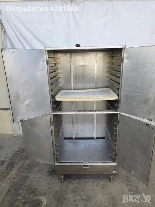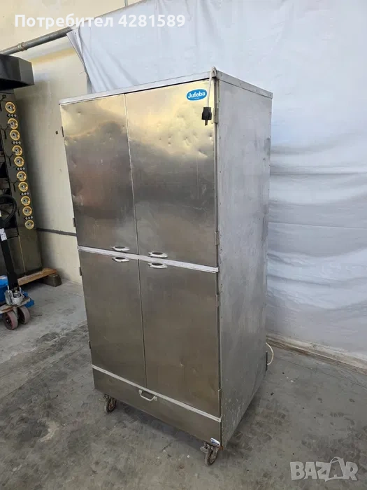 Продавам немски монофазен втасвател Jufeba за тави с размери 78/58см и 60/80см,подходящ за производство на немски понички-берлинери.Втасвателя е механичен,в добро състояние и със следните размери:ширина:84см,височина:71см,височина:180см.