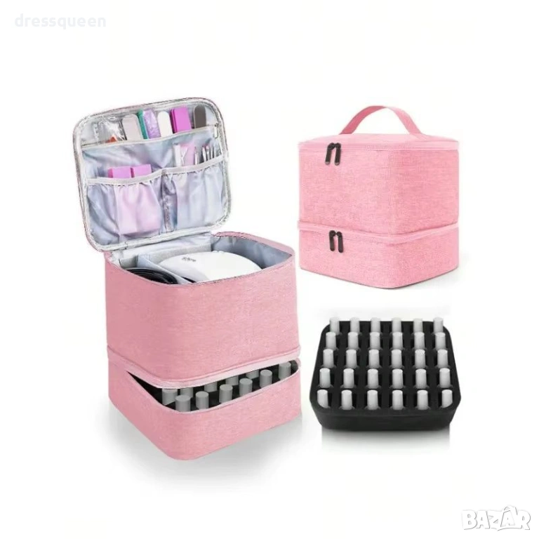Тази двуслойна чанта тип куфар органайзер съчетава функционалност и компактност. Долното отделение е снабдено с защитна пяна за лакове, побираща точно 30 шишенца, докато горната част е предвидена за голямо отделение за лампа и мрежести джобове за пили, четки и инструменти. Материалът от висококачествен найлон/PU с капитонирана текстура осигурява не само здравина, но и професионален вид. Благодарение на размерите си от 25.4 х 23.88 х 21 см, чантата е лесна за пренасяне и побира всичко необходимо за перфектен маникюр навсякъде.