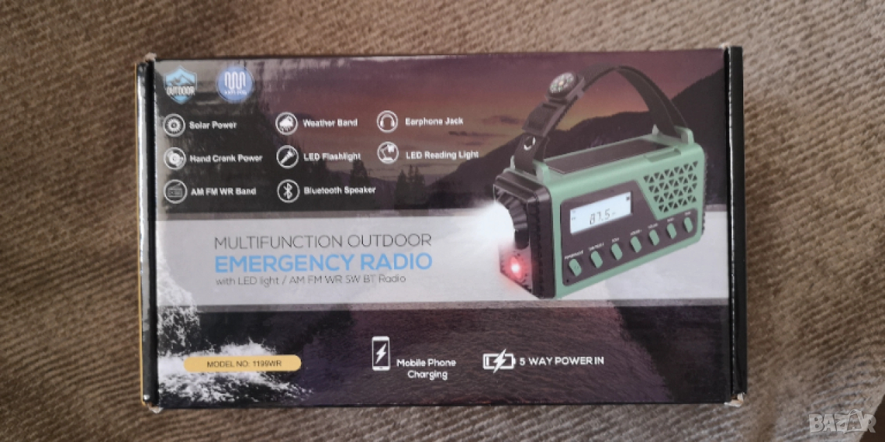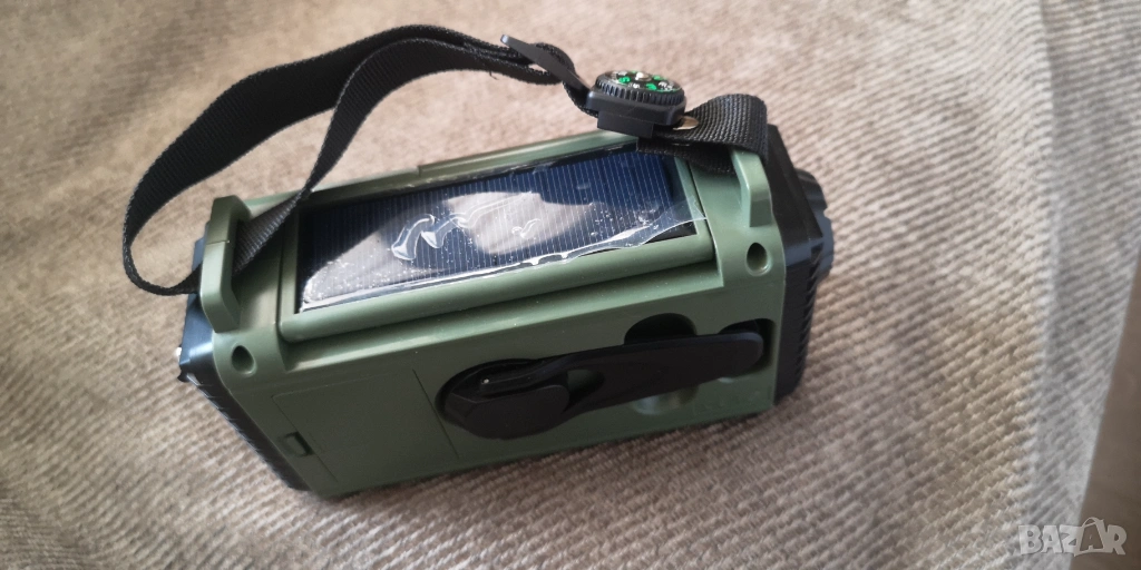 Мултифункционално радио с Bluetooth, FM, AM, SW, WR, 5 начина на зареждане, слънчев панел, прожектор, странична светлина, USB, зареждане с манивела, SOS аларма и светлина. С акумулатор и отделно гнездо за батерии. Перфектен продукт необходим за феновете на природата.