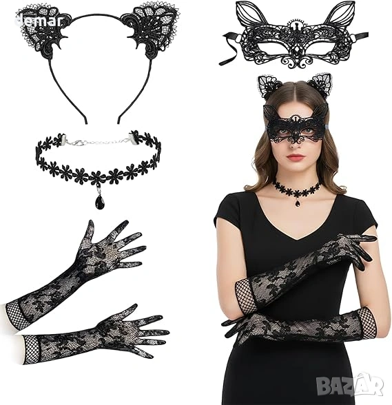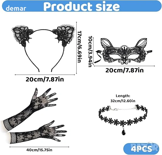 Костюм за котка от 4 части с ръкавици, комплект с котешки уши лента за глава, лента за врата и маска