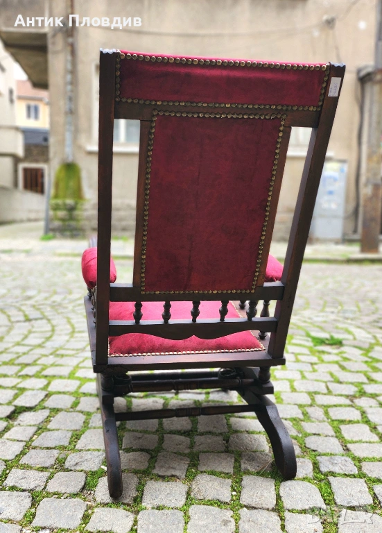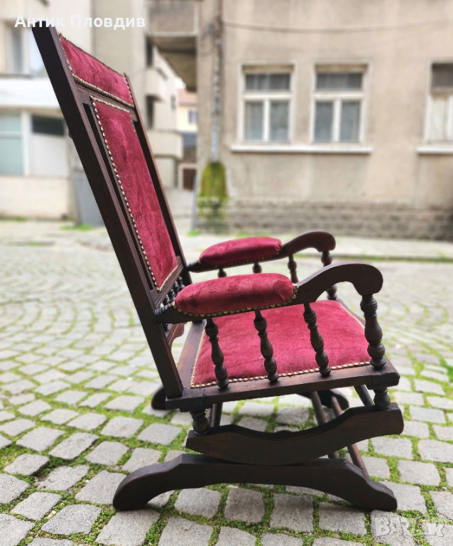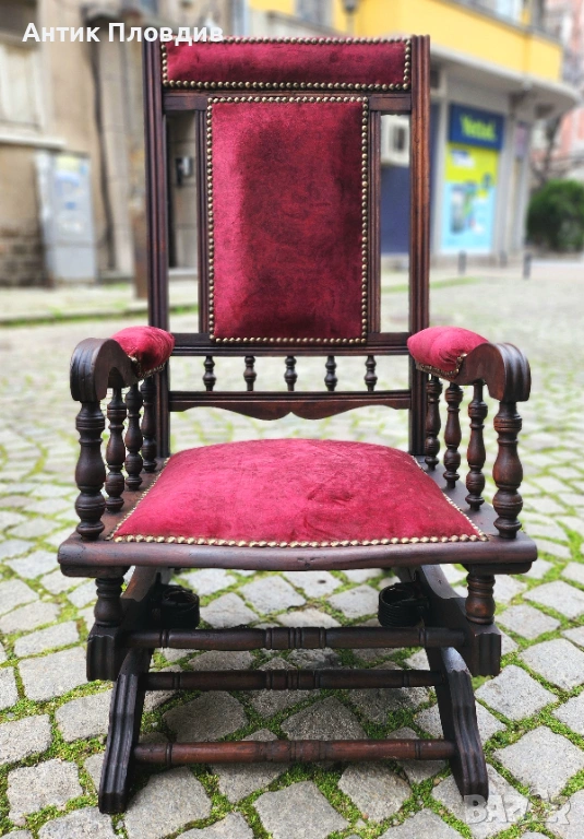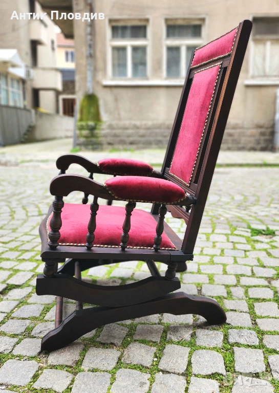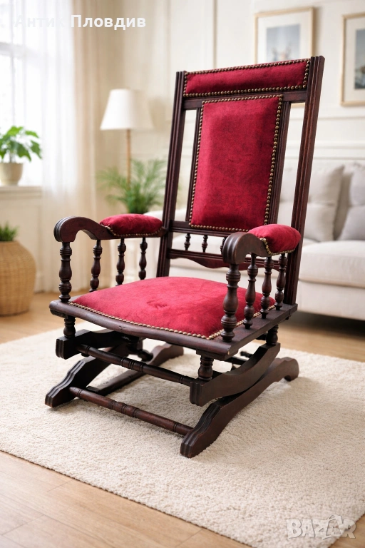 Колекционерски антикварен люлеещ стол с масив и богата текстилна тапицерия. Детайлите с кабари и пропорциите издават салонен модел от края на XIX – началото на XX век (ориентировъчно). Предмет с рядко присъствие и силен декоративен ефект.