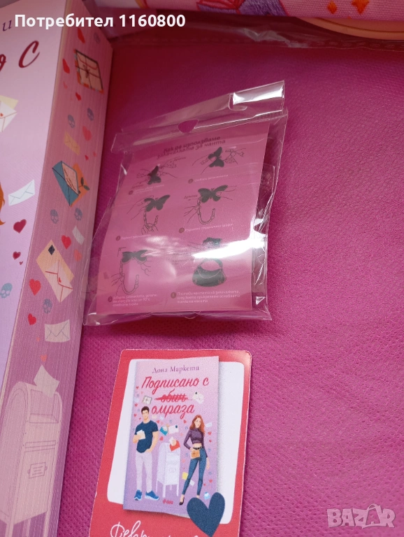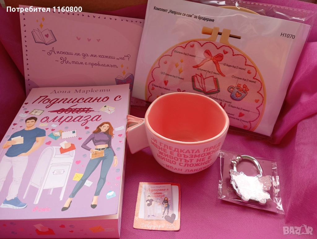 Книжна кутия Charly Wilde, съдържа книга с цветни порезки "Подписано с омраза" - Дона Маркети, керамична чаша, комплект за бродиране, картичка, стикер, закопчалка за чанта.