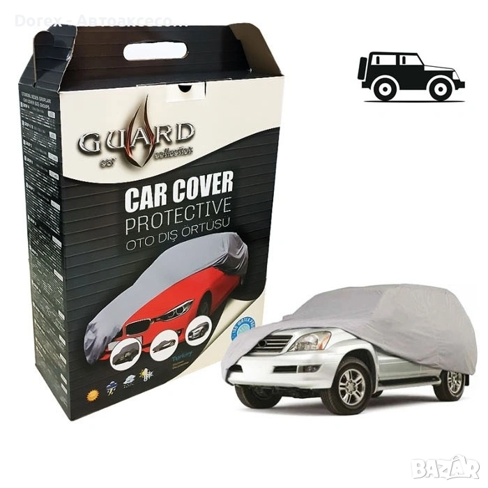Покривалото Guard за джипове, SUV и ванове е висококачествено защитно решение, създадено да предпазва вашето превозно средство при всякакви атмосферни условия. Осигурява надеждна защита от дъжд, сняг, прах, слънце, вятър и замърсявания.