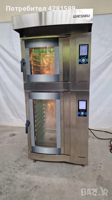 Продавам 2бр. немски конвектомати-фурни за хлебни и сладкарски изделия Wiesheu за 10 и 5 тави за печене с размери 60/40см,фурната е с пароуловител и програматор на български език.
