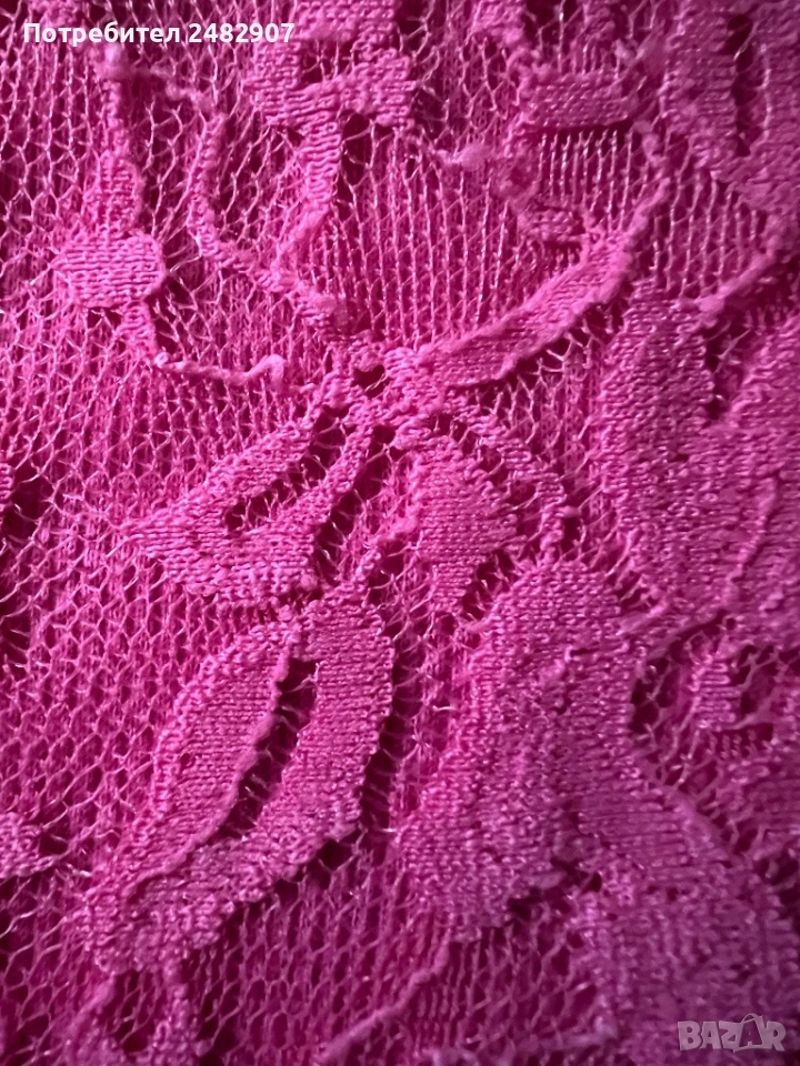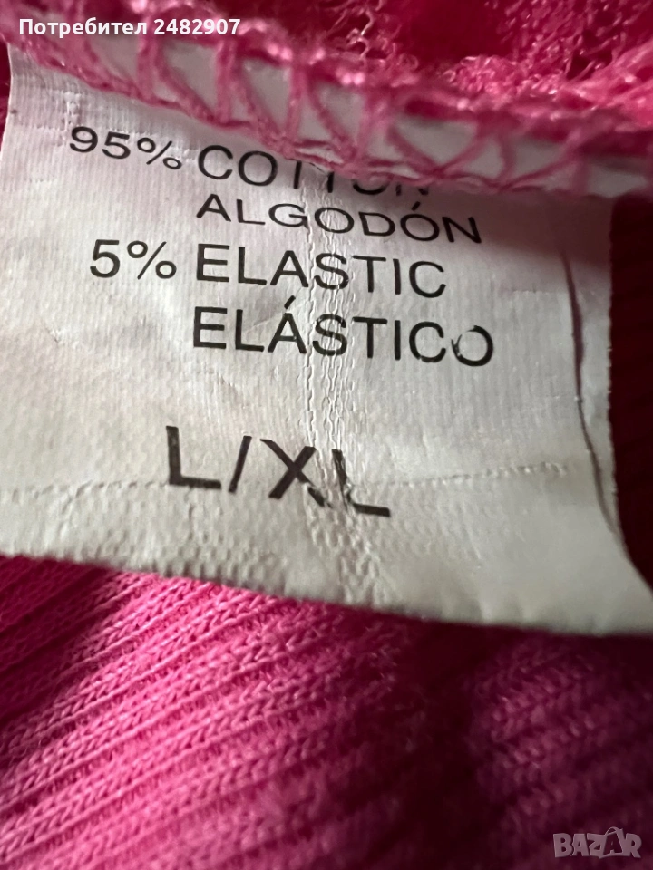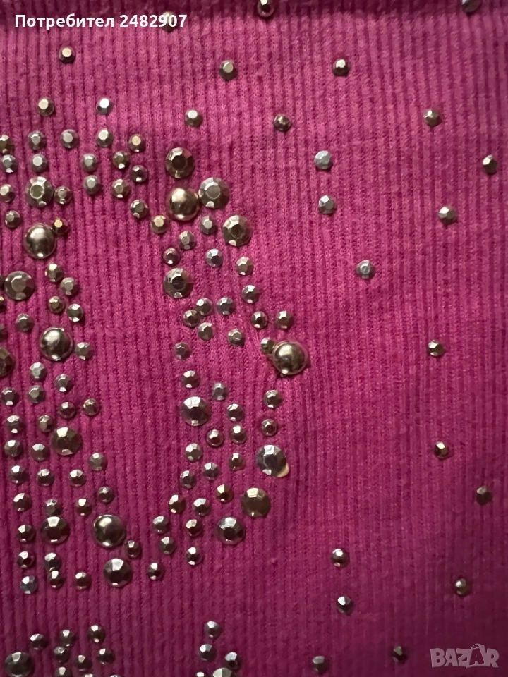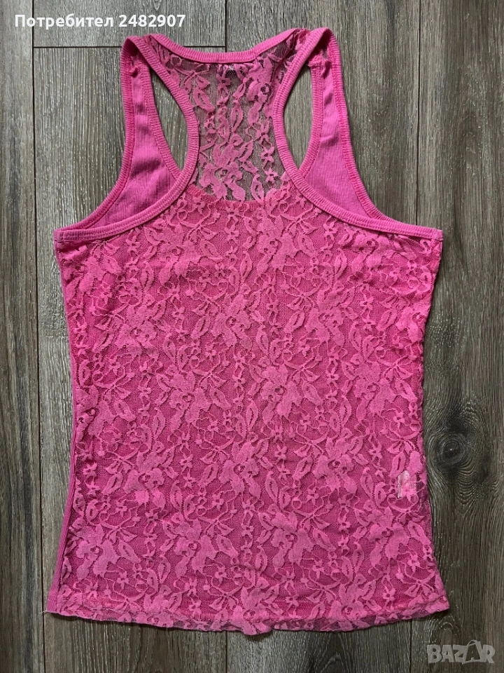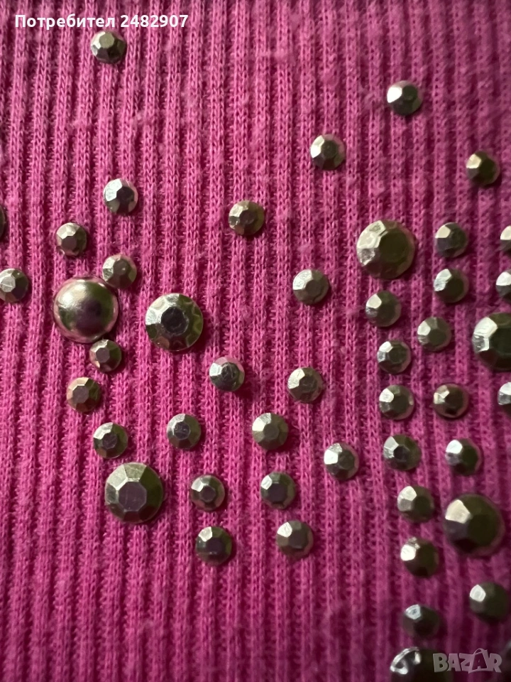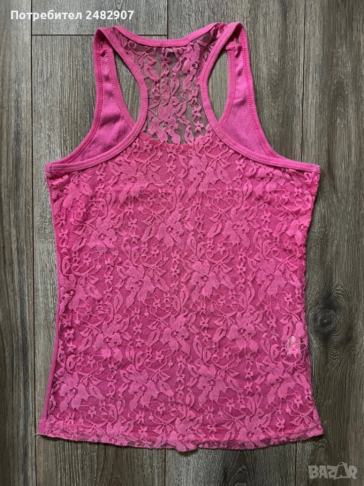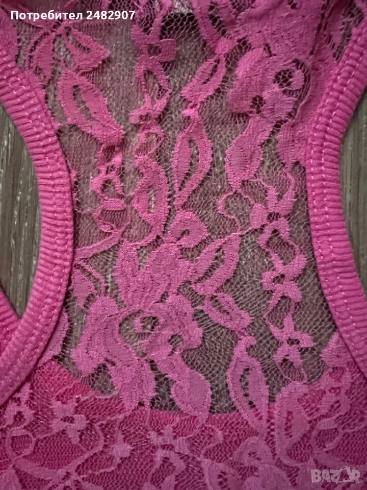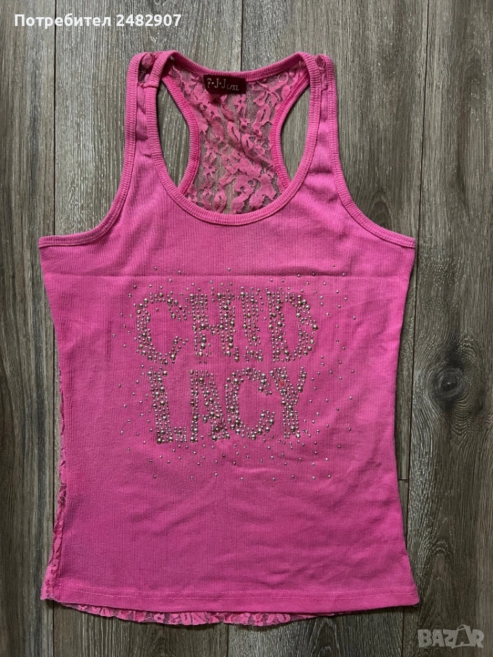 Дамски розов потник с камъчета отпред и дантелен гръб, размер L-XL. Съдържа 95 % памук и 5 % еластан. Ширина в раменете - 22 см, ширина под мишниците - 39 см, ширина в долната част - 43 см, дължина от рамото до долу - 60 см. Много запазен, почти не е използван.