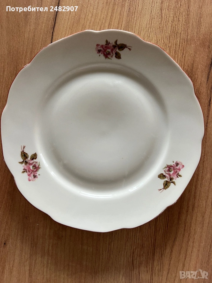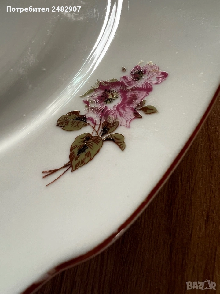 Стара порцеланова плитка чиния, българско производство. Диаметър - 23,5 см. Чисто нова, не е използвана, много красива, с цветни мотиви и тъмно червен кант. Подходяща за допълване, колекция, декорация или просто за подарък.