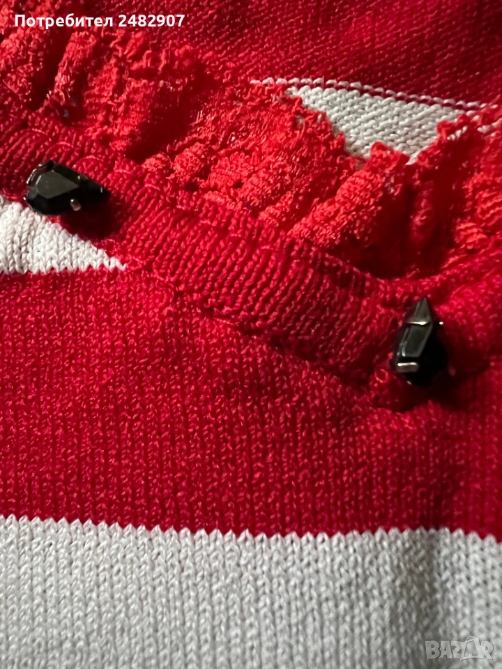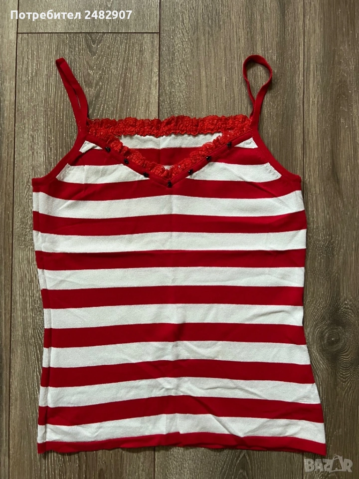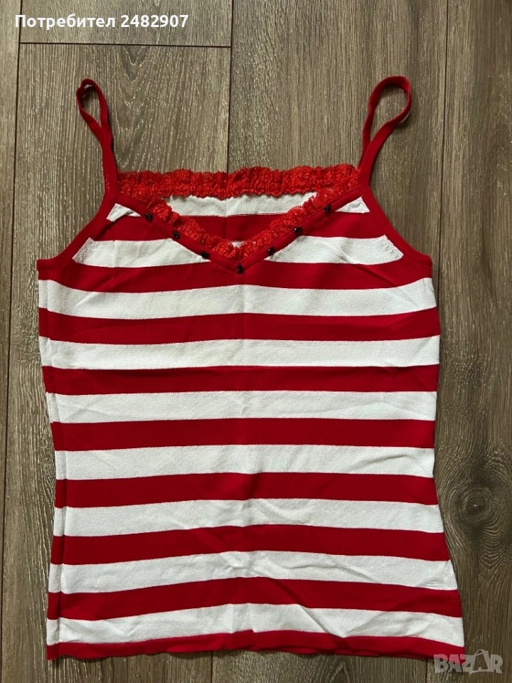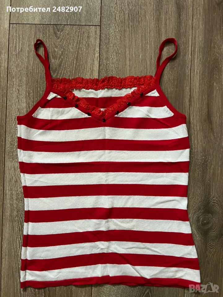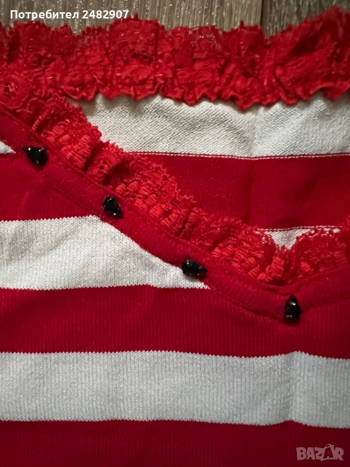 Машинно плетен дамски потник с камъчета и дантела в червено и бяло, размер S Ширина в раменете - 24 см, ширина под мишниците - 36 см, ширина в долната част - 39 см, дължина от горната част на презрамките до долу - 53 см. Много запазен, почти не е използван.
