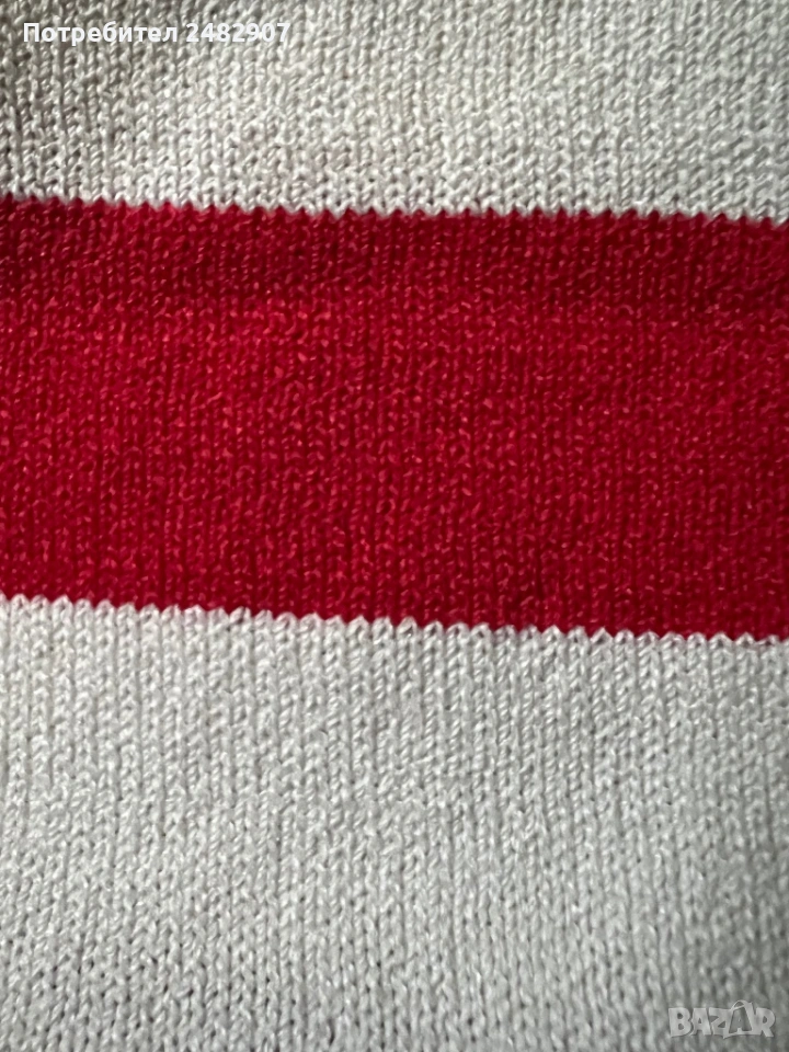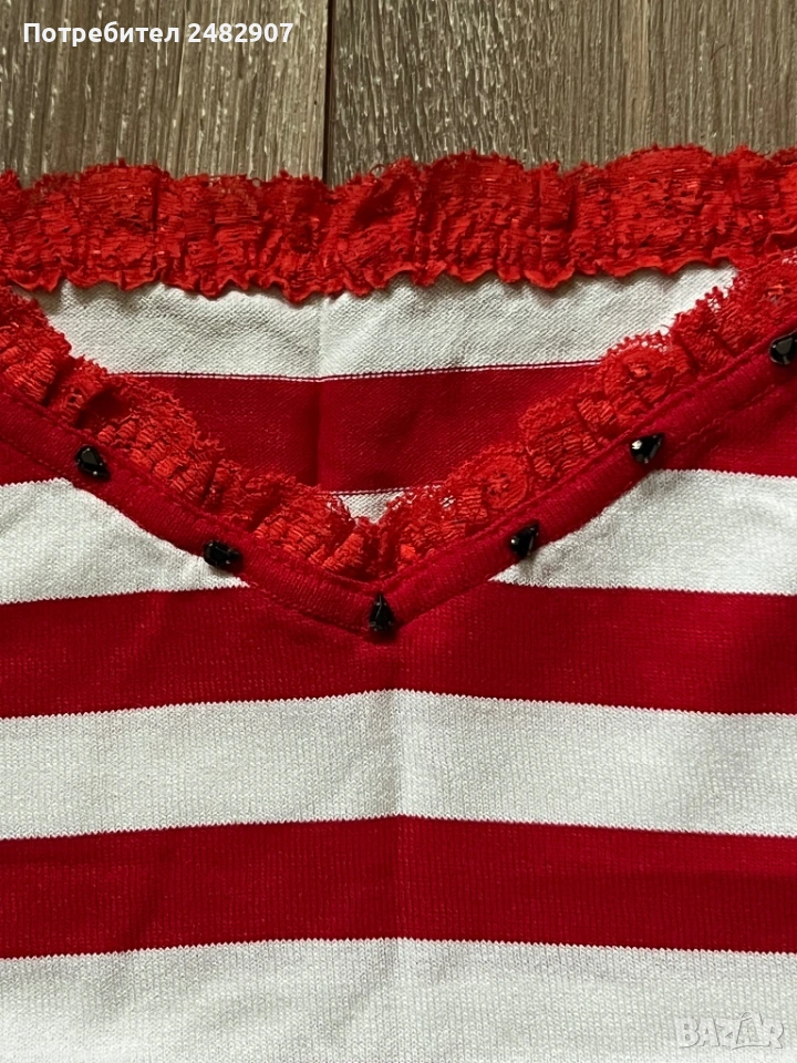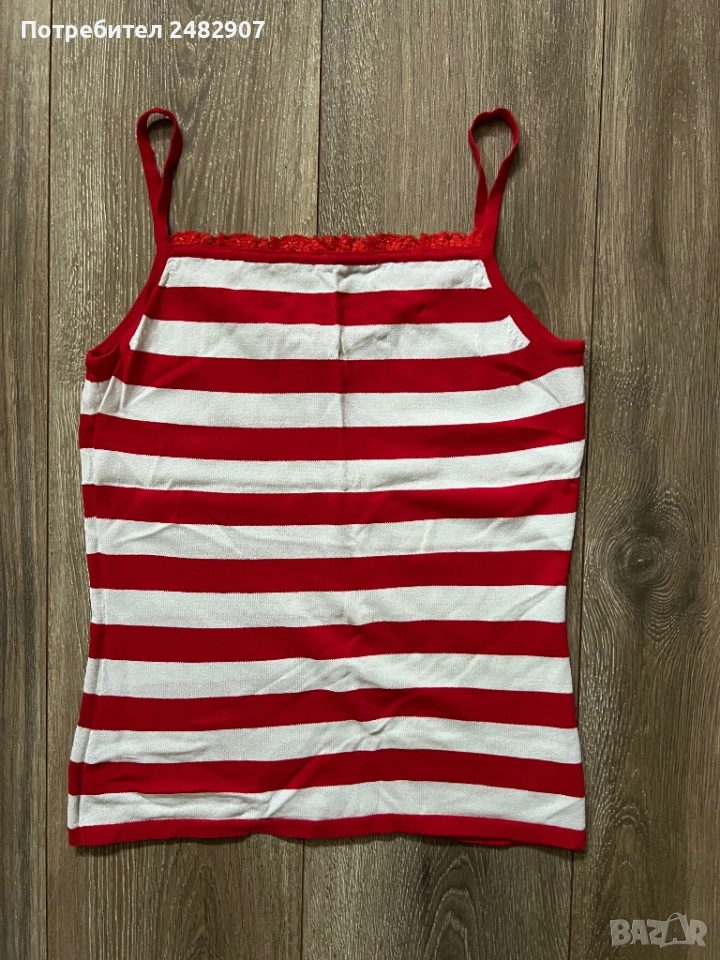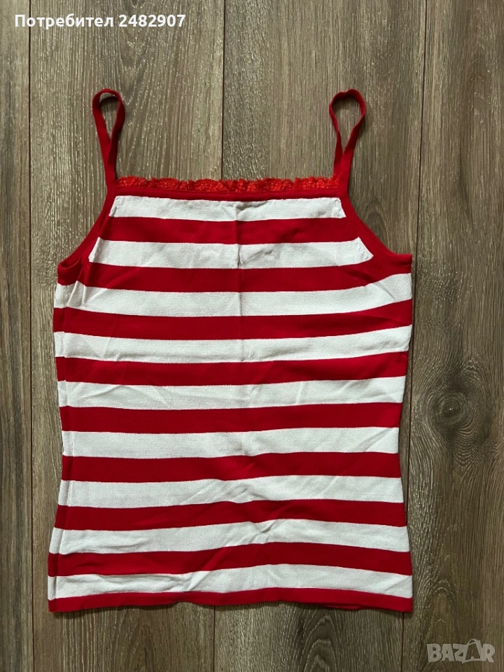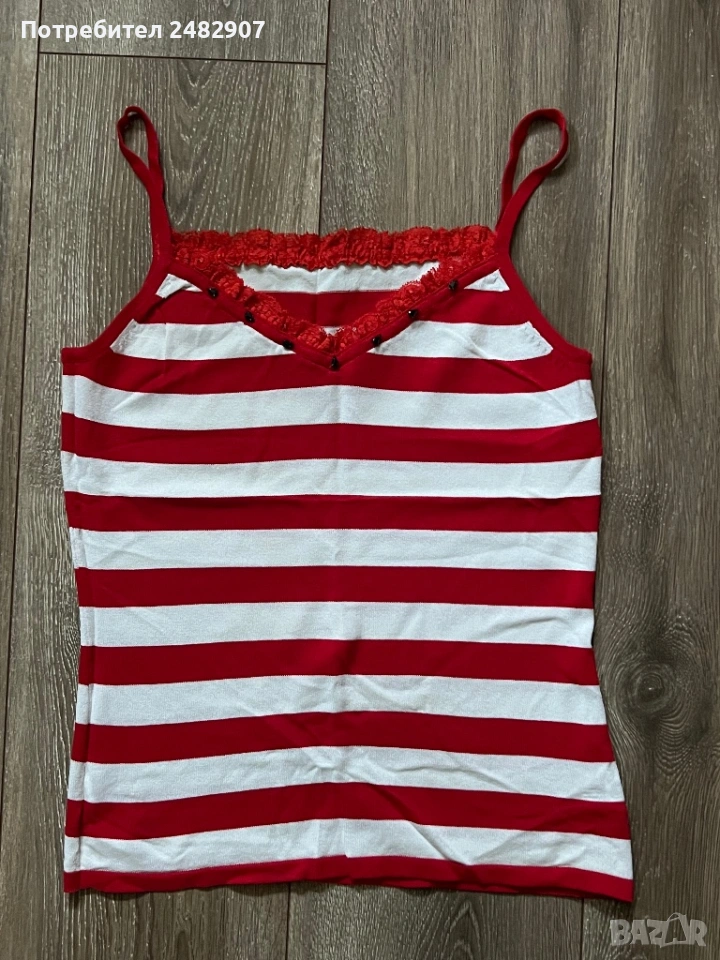 Машинно плетен дамски потник с камъчета и дантела в червено и бяло, размер S Ширина в раменете - 24 см, ширина под мишниците - 36 см, ширина в долната част - 39 см, дължина от горната част на презрамките до долу - 53 см. Много запазен, почти не е използван.