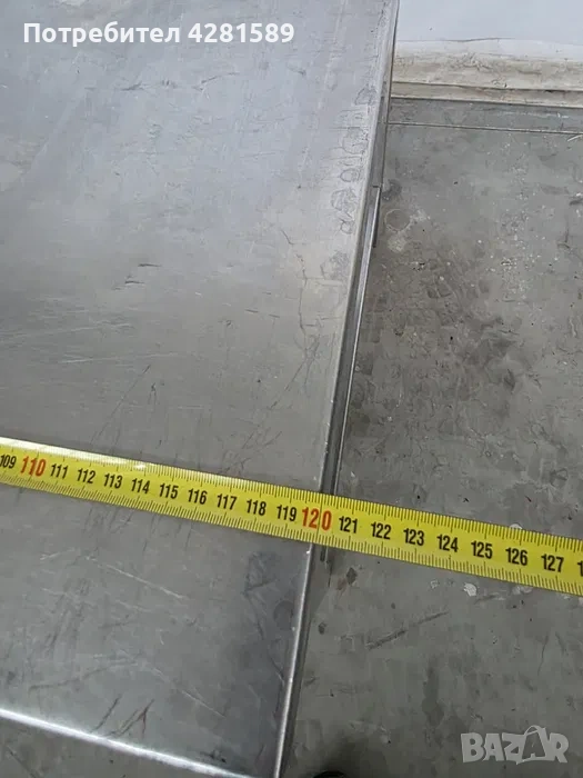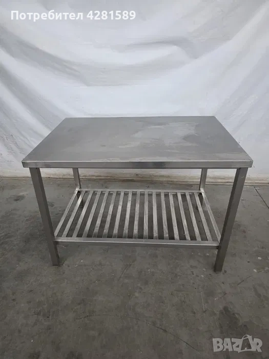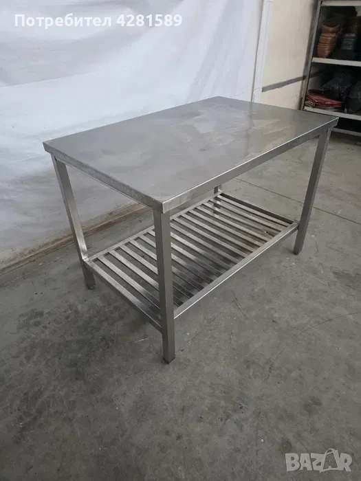Продавам работна маса изцяло от неръждаема стомана със следните размери: ширина:120см,дълбочина: 80см,височина:87см.