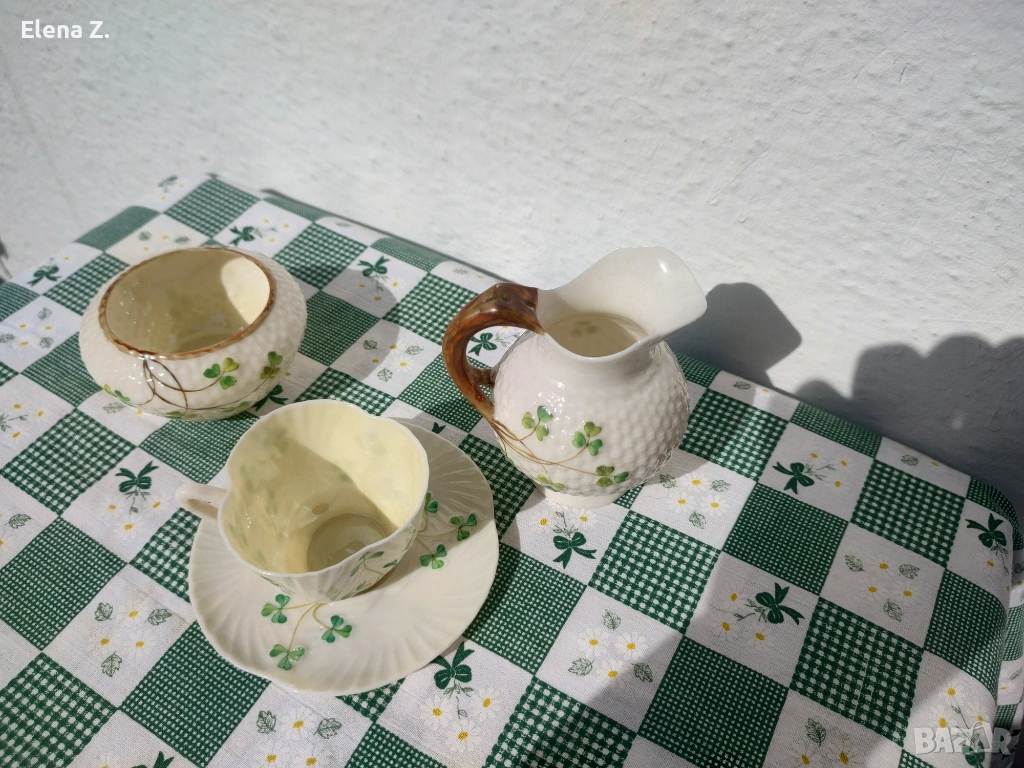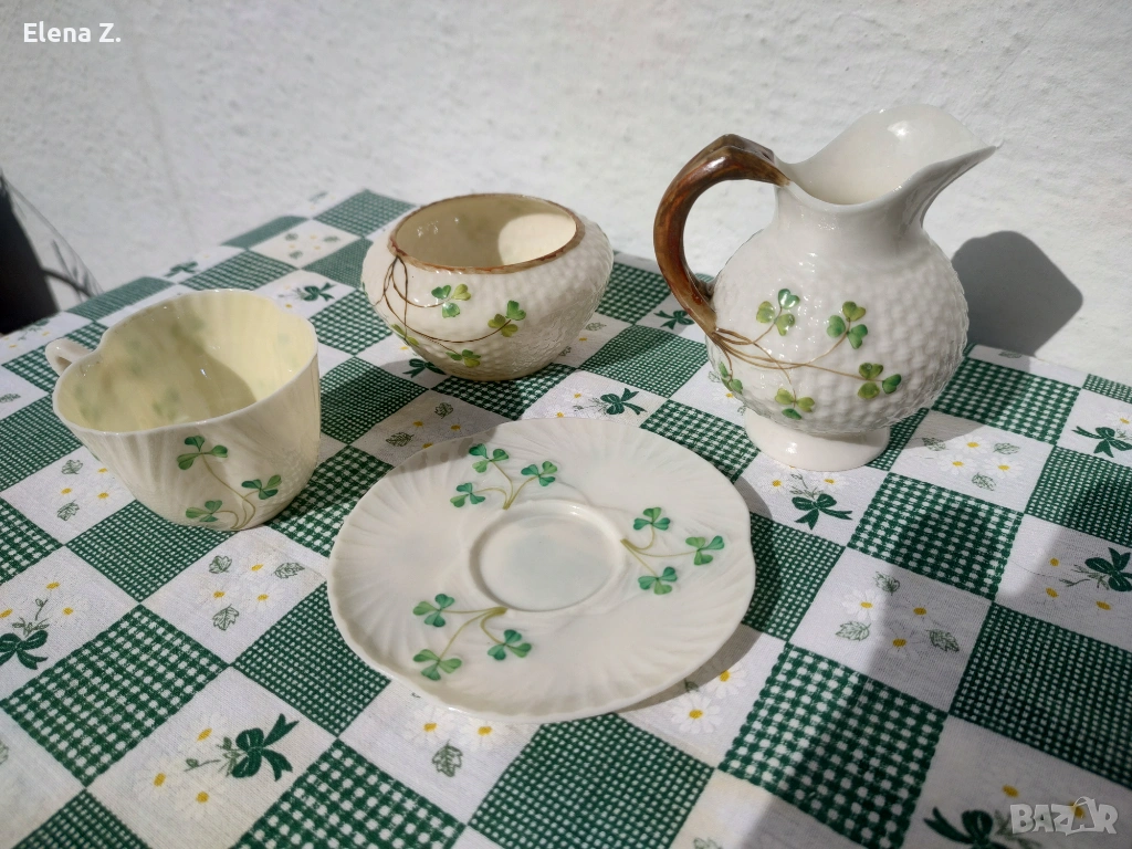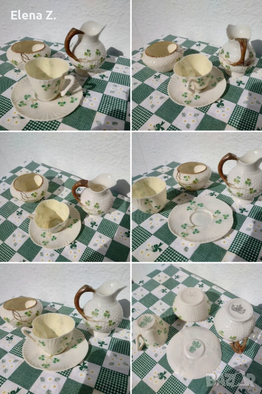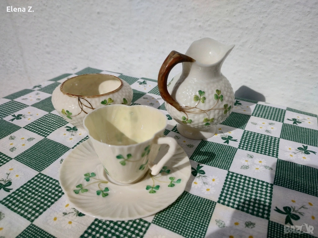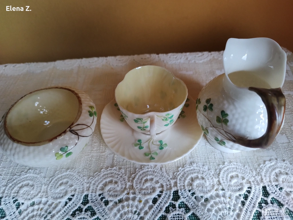 Предлагам няколко комплекта съдове от ирландските майстори на ръчно изработения и рисувания, тънък като перце париански порцелан Belleek. Съдчетата са от различни серии, и различни години, но всички са с традиционните нежни, ръчно рисувани трилистни детелинки. Чашките всички са с типичното за Belleek цълто лустро/глазура отвътре, и с цвят нежна слонова кост със седефен отблясък. Фини, направо прозрачни на светлината.