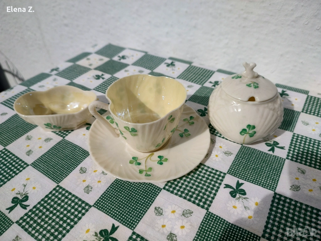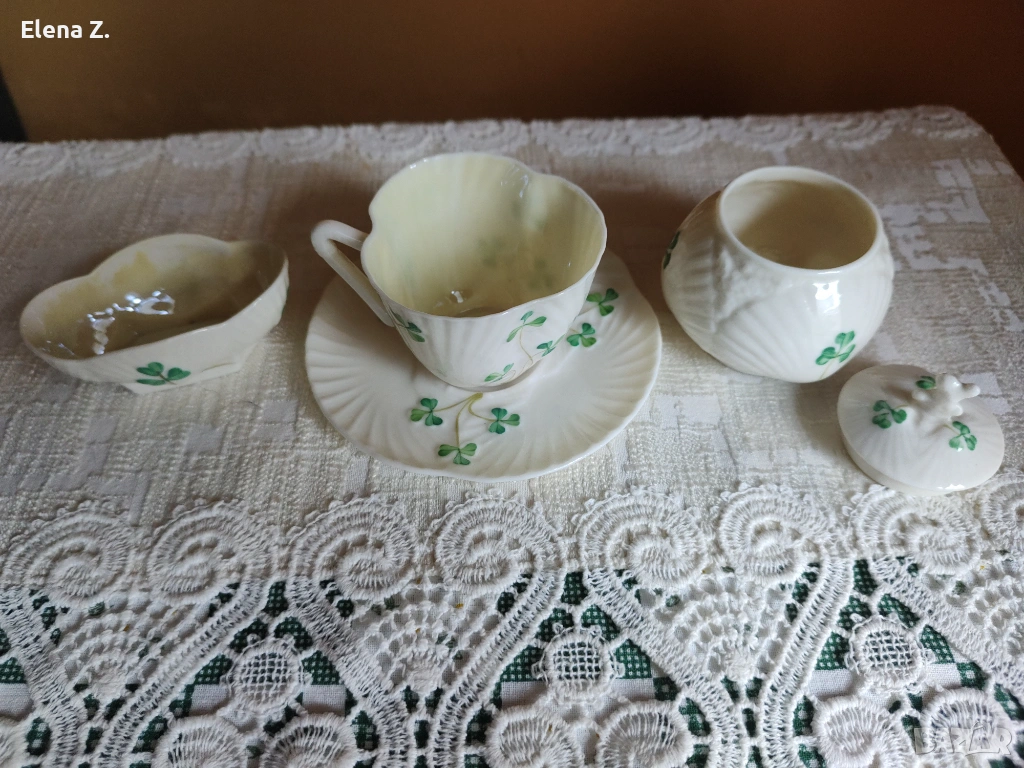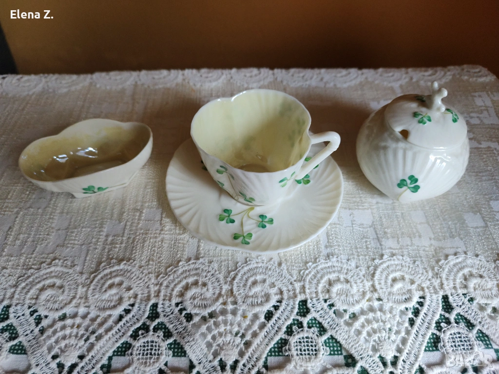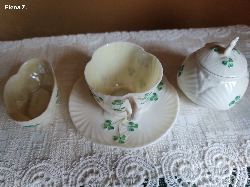 Предлагам няколко комплекта съдове от ирландските майстори на ръчно изработения и рисувания, тънък като перце париански порцелан Belleek. Съдчетата са от различни серии, и различни години, но всички са с традиционните нежни, ръчно рисувани трилистни детелинки. Чашките всички са с типичното за Belleek цълто лустро/глазура отвътре, и с цвят нежна слонова кост със седефен отблясък. Фини, направо прозрачни на светлината.