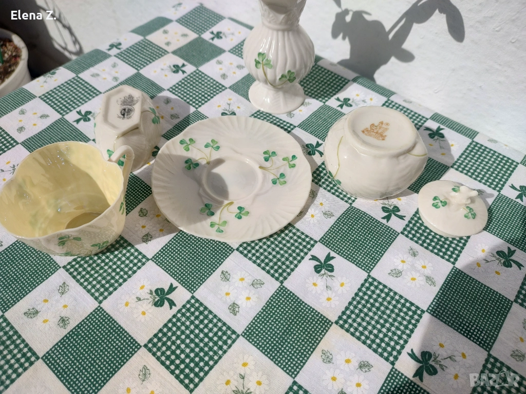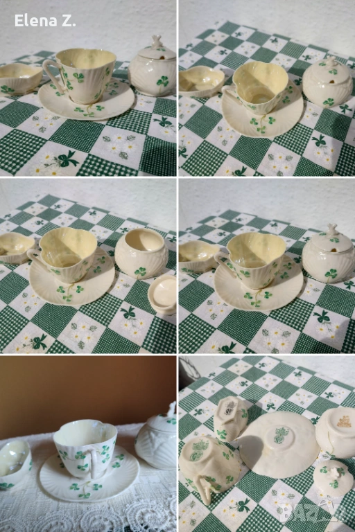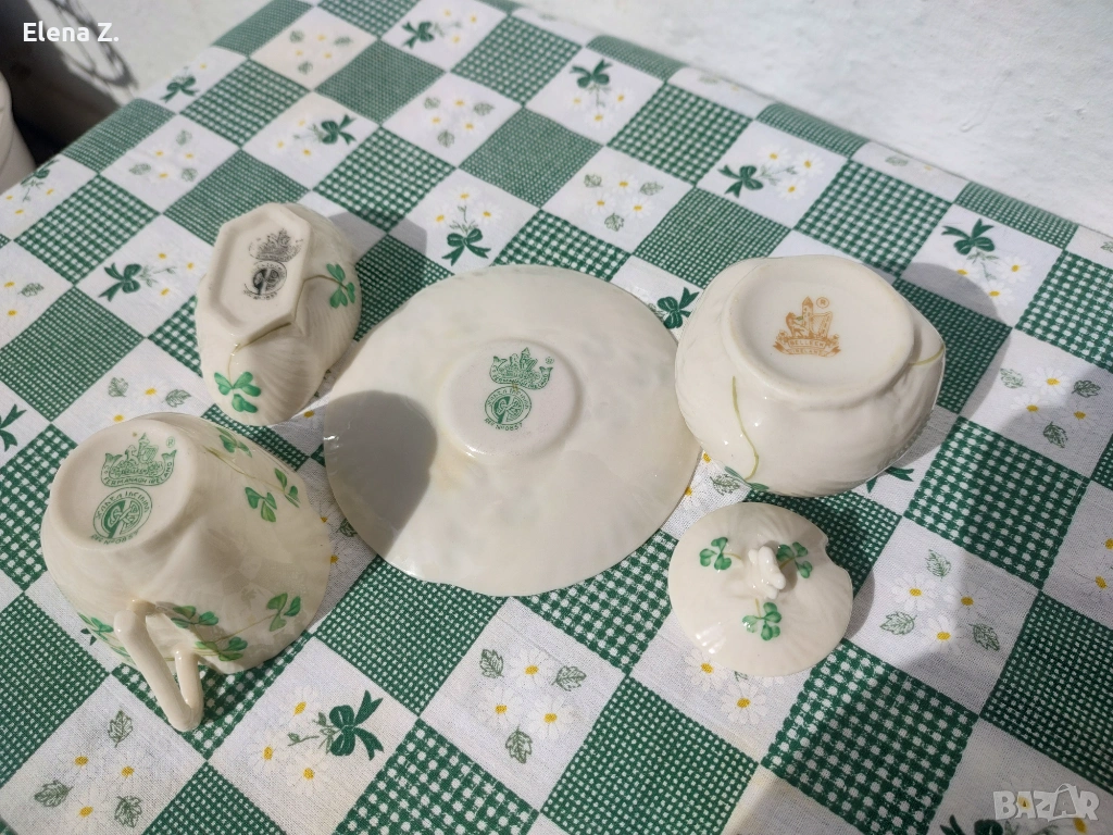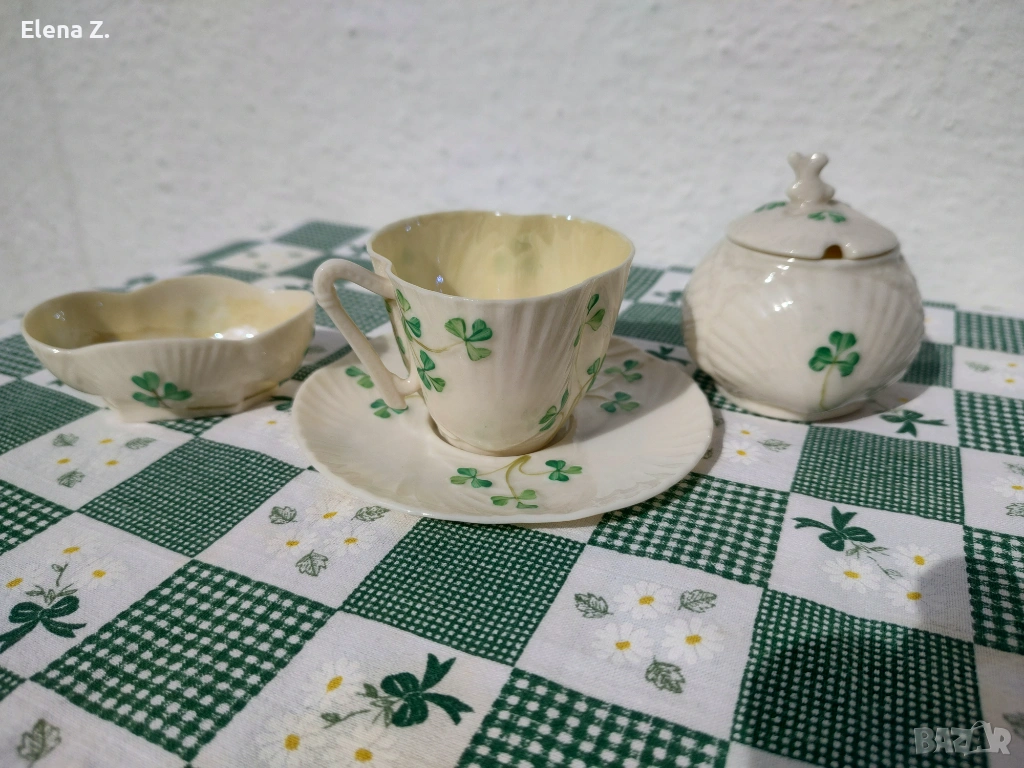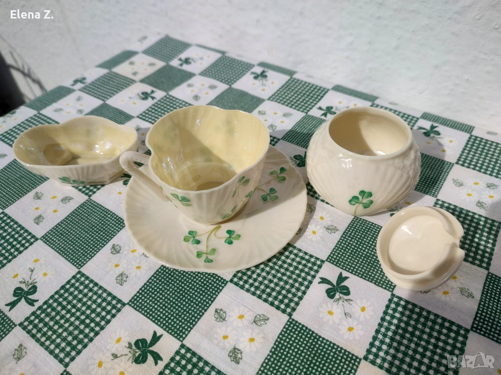 Предлагам няколко комплекта съдове от ирландските майстори на ръчно изработения и рисувания, тънък като перце париански порцелан Belleek. Съдчетата са от различни серии, и различни години, но всички са с традиционните нежни, ръчно рисувани трилистни детелинки. Чашките всички са с типичното за Belleek цълто лустро/глазура отвътре, и с цвят нежна слонова кост със седефен отблясък. Фини, направо прозрачни на светлината.