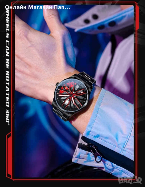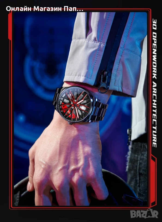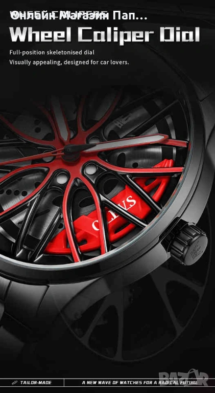 нестандартния дизайн. Вместо класически циферблат, моделът разполага с 3D дизайн на спортна автомобилна джанта със спирачен диск и накладки, който придава впечатляваща визия.