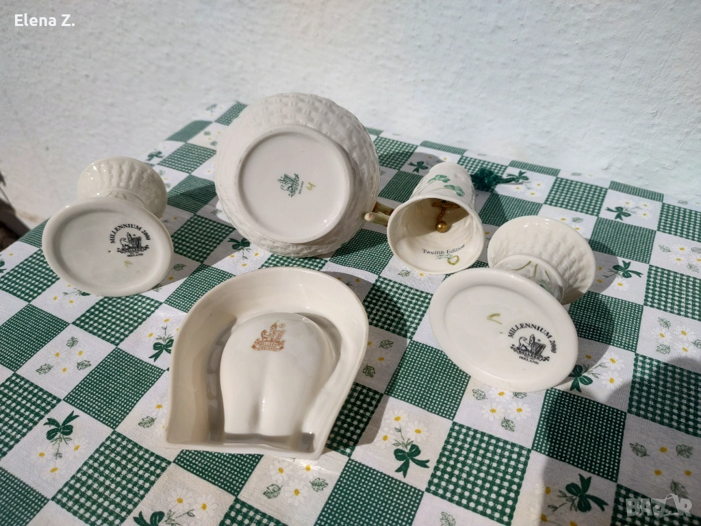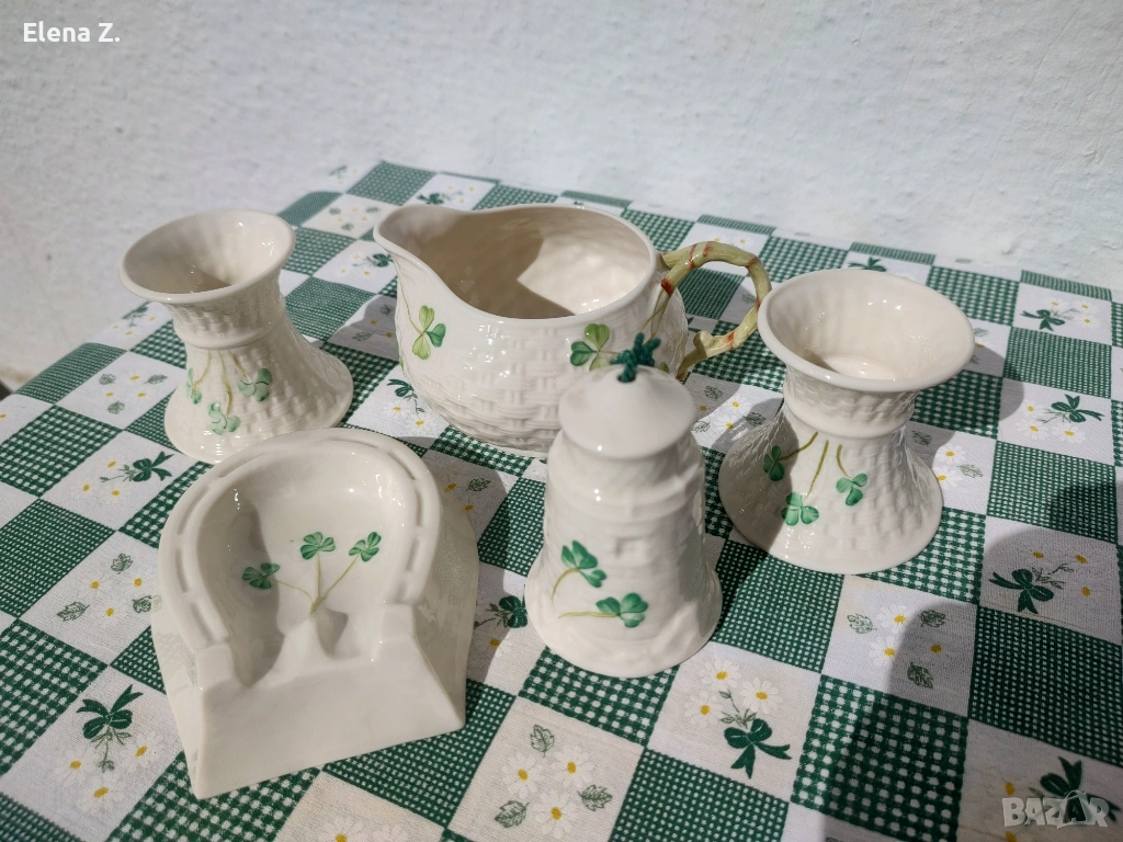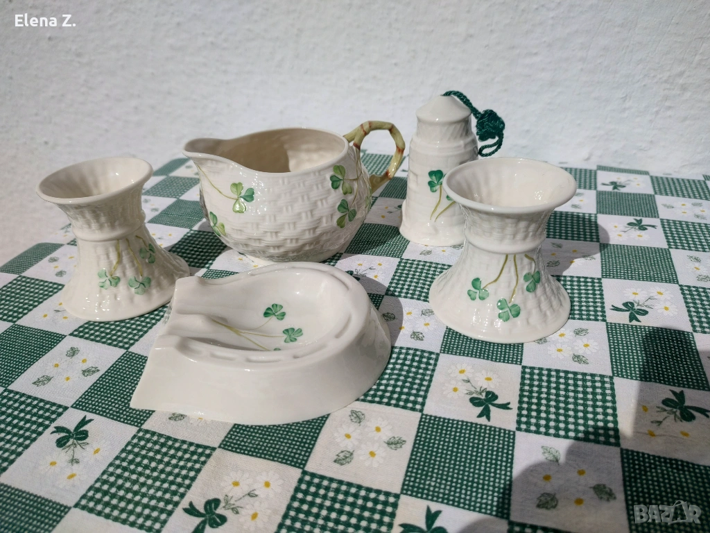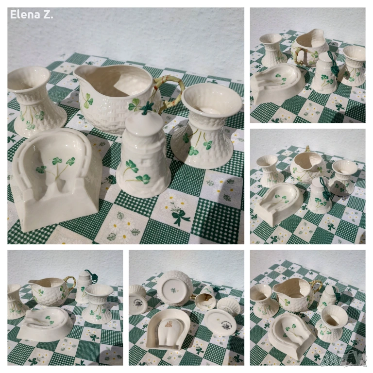 Предлагам няколко комплекта съдове от ирландските майстори на ръчно изработения и рисувания, тънък като перце париански порцелан Belleek. Съдчетата са от различни серии, и различни години, но всички са с традиционните нежни, ръчно рисувани трилистни детелинки. Чашките всички са с типичното за Belleek цълто лустро/глазура отвътре, и с цвят нежна слонова кост със седефен отблясък. Фини, направо прозрачни на светлината.