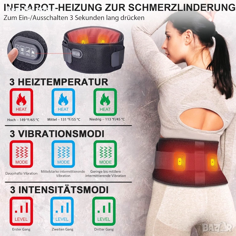 МАСАЖОР С 3 РЕЖИМА Този отопляем масажор за гръб има 3 режима на масаж, което ви позволява да персонализирате комплекта за максимален комфорт. Вибрационният масаж с двоен мотор помага за допълнително облекчаване на напрежението и болката в долната част на гърба, кръста, кръста, врата, раменете, краката и бедрата. Функциите за топлина и масаж могат да се използват заедно или поотделно.